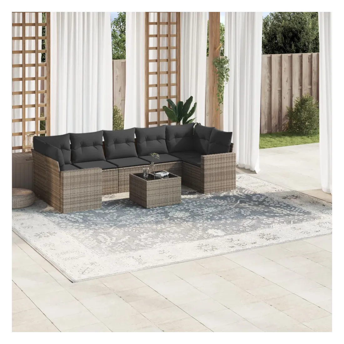 Cet ensemble de canapés de jardin est le complément parfait de votre arrière-cour, terrasse ou patio, offrant un espace confortable et accueillant pour discuter avec la famille et les amis ou simplement se détendre et profiter de l'extérieur. Matériau durable : la résine tressée, également connue sous le nom de poly rotin, est un matériau synthétique solide et nécessitant peu d'entretien qui ressemble au rotin naturel. Il est léger, facile à nettoyer et couramment utilisé pour les meubles d'extérieur en raison de sa durabilité et de ses propriétés de résistance aux intempéries.Expérience d'assise confortable : ce mobilier d'extérieur, doté de coussins épais, offre une expérience d'assise confortable. Les larges accoudoirs offrent également un endroit pratique pour garder votre téléphone portable, vos tasses ou d'autres petits objets à portée de main.Housse amovible et lavable : ces coussins de siège sont dotés de housses amovibles pour un lavage et un entretien faciles.Dessus en verre : le dessus de la table d'extérieur est fabriqué en verre trempé solide et durable, ce qui le rend facile à nettoyer avec un chiffon humide et ajoute une touche d'élégance à votre espace extérieur.Conception modulaire : cet ensemble de meubles d'extérieur a une conception modulaire, ce qui le rend complètement flexible et facile à déplacer, afin que vous puissiez créer un agencement de meubles d'extérieur personnalisé. Bon à savoir :Pour que vos meubles d'extérieur restent beaux, nous vous recommandons de les protéger avec une housse imperméable.