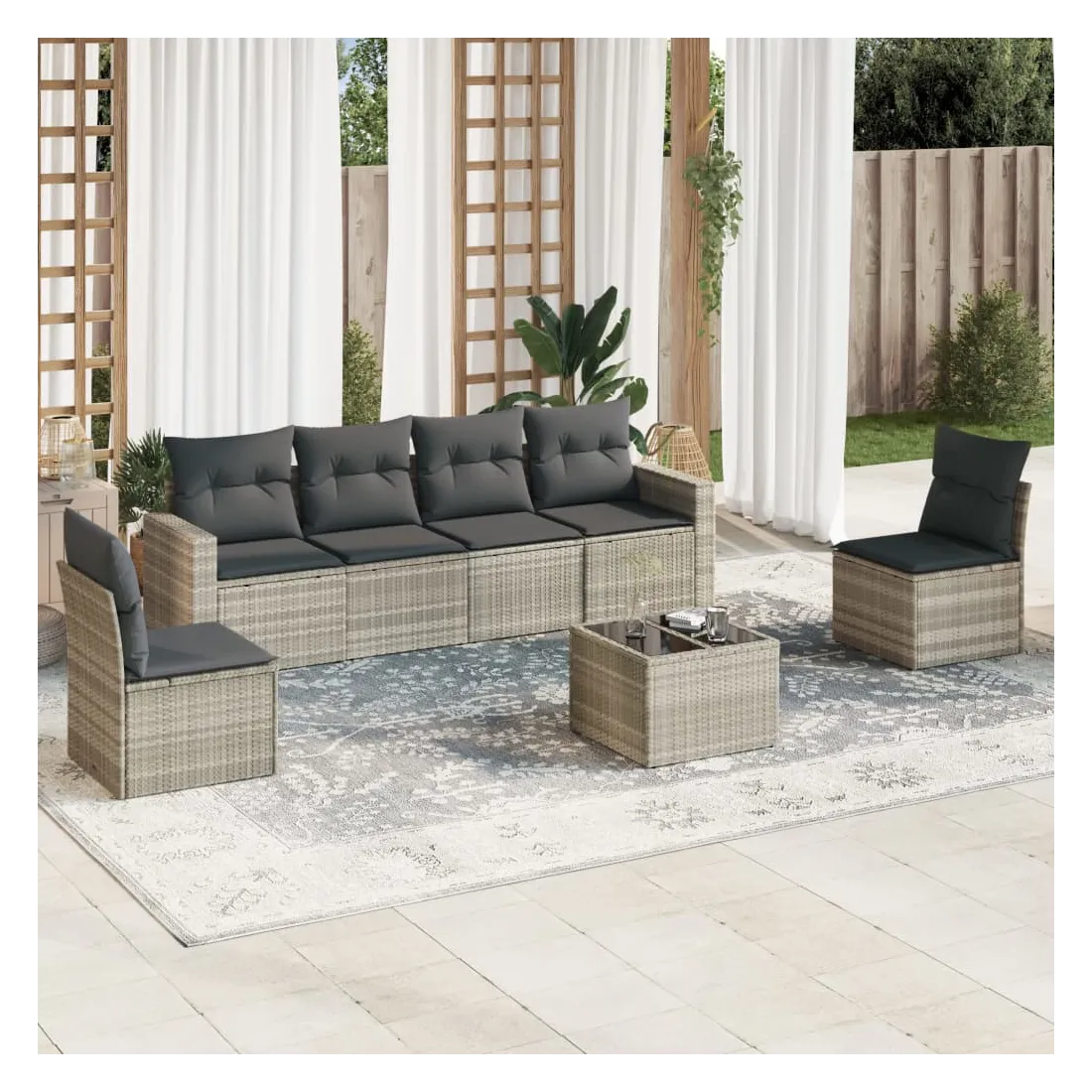 Cet ensemble de canapés de jardin est le complément parfait de votre arrière-cour, terrasse ou patio, offrant un espace confortable et accueillant pour discuter avec la famille et les amis ou simplement se détendre et profiter de l'extérieur. Matériau durable : la résine tressée, également connue sous le nom de poly rotin, est un matériau synthétique solide et nécessitant peu d'entretien qui ressemble au rotin naturel. Il est léger, facile à nettoyer et couramment utilisé pour les meubles d'extérieur en raison de sa durabilité et de ses propriétés de résistance aux intempéries.Expérience d'assise confortable : ce mobilier d'extérieur, doté de coussins épais, offre une expérience d'assise confortable. Les larges accoudoirs offrent également un endroit pratique pour garder votre téléphone portable, vos tasses ou d'autres petits objets à portée de main.Housse amovible et lavable : ces coussins de siège sont dotés de housses amovibles pour un lavage et un entretien faciles.Dessus en verre : le dessus de la table d'extérieur est fabriqué en verre trempé solide et durable, ce qui le rend facile à nettoyer avec un chiffon humide et ajoute une touche d'élégance à votre espace extérieur.Conception modulaire : cet ensemble de meubles d'extérieur a une conception modulaire, ce qui le rend complètement flexible et facile à déplacer, afin que vous puissiez créer un agencement de meubles d'extérieur personnalisé. Bon à savoir :Pour que vos meubles d'extérieur restent beaux, nous vous recommandons de les protéger avec une housse imperméable.