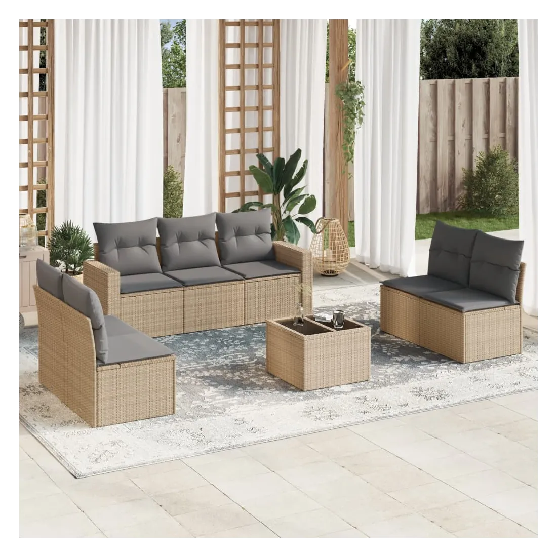 Cet ensemble de canapés de jardin est le complément parfait de votre arrière-cour, terrasse ou patio, offrant un espace confortable et accueillant pour discuter avec la famille et les amis ou simplement se détendre et profiter de l'extérieur. Matériau durable : la résine tressée, également connue sous le nom de poly rotin, est un matériau synthétique solide et nécessitant peu d'entretien qui ressemble au rotin naturel. Il est léger, facile à nettoyer et couramment utilisé pour les meubles d'extérieur en raison de sa durabilité et de ses propriétés de résistance aux intempéries.Expérience d'assise confortable : ce mobilier d'extérieur, doté de coussins épais, offre une expérience d'assise confortable. Les larges accoudoirs offrent également un endroit pratique pour garder votre téléphone portable, vos tasses ou d'autres petits objets à portée de main.Housse amovible et lavable : ces coussins de siège sont dotés de housses amovibles pour un lavage et un entretien faciles.Dessus en verre : le dessus de la table d'extérieur est fabriqué en verre trempé solide et durable, ce qui le rend facile à nettoyer avec un chiffon humide et ajoute une touche d'élégance à votre espace extérieur.Conception modulaire : cet ensemble de meubles d'extérieur a une conception modulaire, ce qui le rend complètement flexible et facile à déplacer, afin que vous puissiez créer un agencement de meubles d'extérieur personnalisé. Bon à savoir :Pour que vos meubles d'extérieur restent beaux, nous vous recommandons de les protéger avec une housse imperméable.