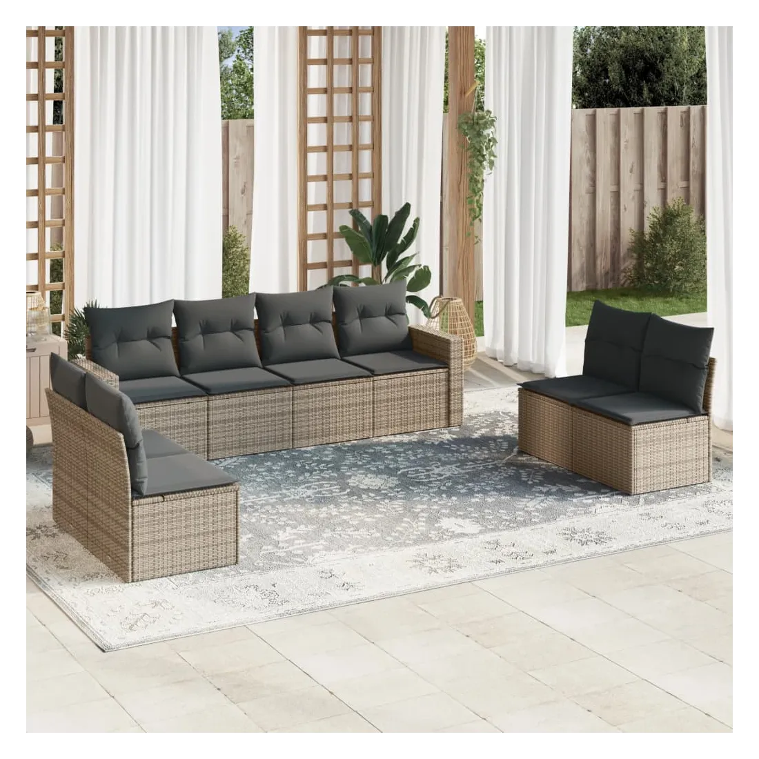 Cet ensemble de canapés de jardin est le complément parfait de votre arrière-cour, terrasse ou patio, offrant un espace confortable et accueillant pour discuter avec la famille et les amis ou simplement se détendre et profiter de l'extérieur. Matériau durable : la résine tressée, également connue sous le nom de poly rotin, est un matériau synthétique solide et nécessitant peu d'entretien qui ressemble au rotin naturel. Il est léger, facile à nettoyer et couramment utilisé pour les meubles d'extérieur en raison de sa durabilité et de ses propriétés de résistance aux intempéries.Expérience d'assise confortable : ce mobilier d'extérieur, doté de coussins épais, offre une expérience d'assise confortable. Les larges accoudoirs offrent également un endroit pratique pour garder votre téléphone portable, vos tasses ou d'autres petits objets à portée de main.Housse amovible et lavable : ces coussins de siège sont dotés de housses amovibles pour un lavage et un entretien faciles.Conception modulaire : cet ensemble de meubles d'extérieur a une conception modulaire, ce qui le rend complètement flexible et facile à déplacer, afin que vous puissiez créer un agencement de meubles d'extérieur personnalisé. Bon à savoir :Pour que vos meubles d'extérieur restent beaux, nous vous recommandons de les protéger avec une housse imperméable.