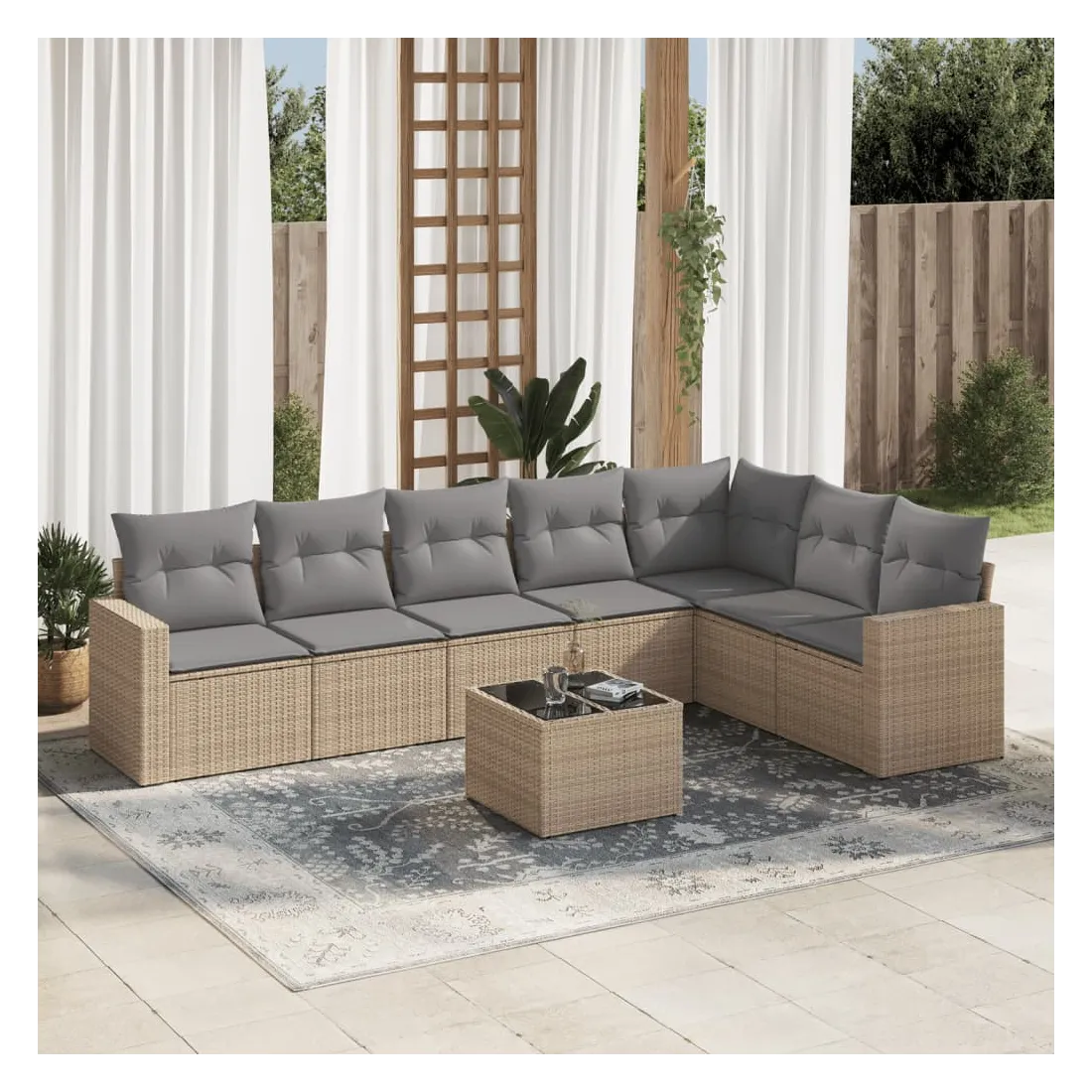 Cet ensemble de canapés de jardin est le complément parfait de votre arrière-cour, terrasse ou patio, offrant un espace confortable et accueillant pour discuter avec la famille et les amis ou simplement se détendre et profiter de l'extérieur. Matériau durable : la résine tressée, également connue sous le nom de poly rotin, est un matériau synthétique solide et nécessitant peu d'entretien qui ressemble au rotin naturel. Il est léger, facile à nettoyer et couramment utilisé pour les meubles d'extérieur en raison de sa durabilité et de ses propriétés de résistance aux intempéries.Expérience d'assise confortable : ce mobilier d'extérieur, doté de coussins épais, offre une expérience d'assise confortable. Les larges accoudoirs offrent également un endroit pratique pour garder votre téléphone portable, vos tasses ou d'autres petits objets à portée de main.Housse amovible et lavable : ces coussins de siège sont dotés de housses amovibles pour un lavage et un entretien faciles.Dessus en verre : le dessus de la table d'extérieur est fabriqué en verre trempé solide et durable, ce qui le rend facile à nettoyer avec un chiffon humide et ajoute une touche d'élégance à votre espace extérieur.Conception modulaire : cet ensemble de meubles d'extérieur a une conception modulaire, ce qui le rend complètement flexible et facile à déplacer, afin que vous puissiez créer un agencement de meubles d'extérieur personnalisé. Bon à savoir :Pour que vos meubles d'extérieur restent beaux, nous vous recommandons de les protéger avec une housse imperméable.