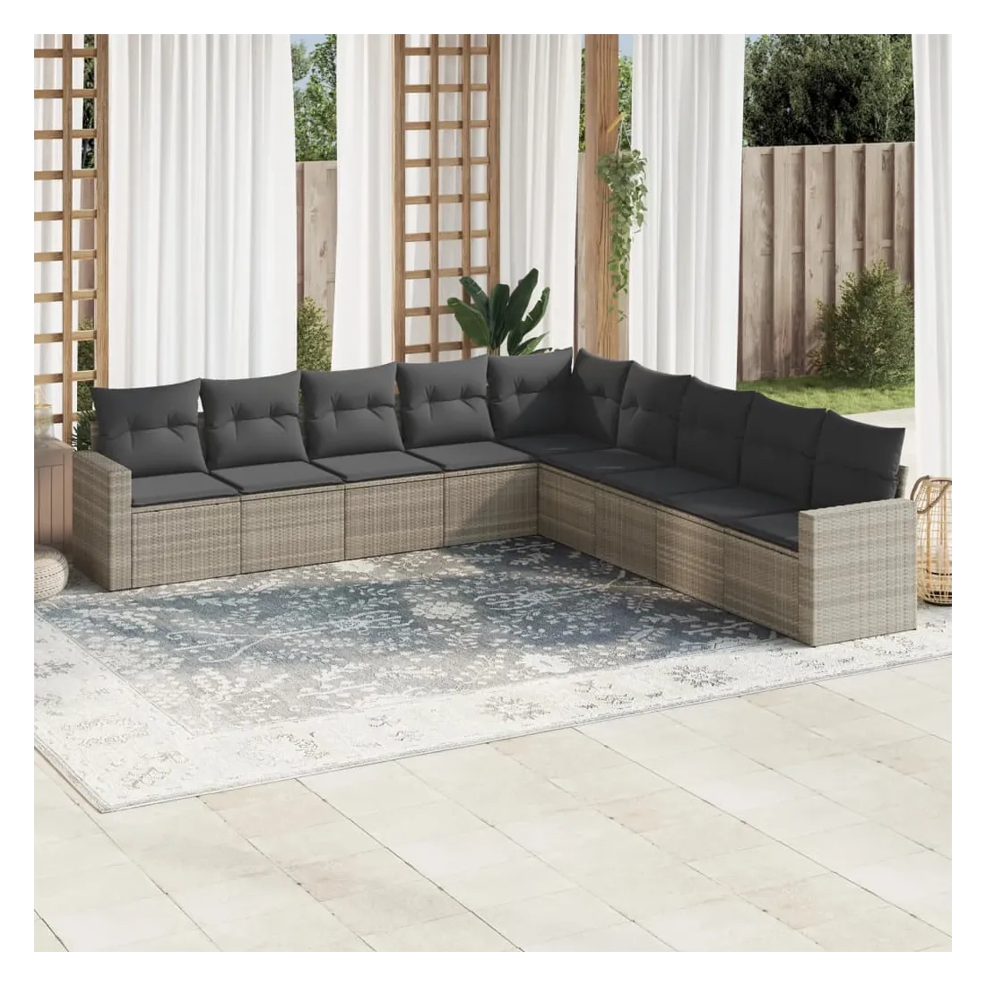 Cet ensemble de canapés de jardin est le complément parfait de votre arrière-cour, terrasse ou patio, offrant un espace confortable et accueillant pour discuter avec la famille et les amis ou simplement se détendre et profiter de l'extérieur. Matériau durable : la résine tressée, également connue sous le nom de poly rotin, est un matériau synthétique solide et nécessitant peu d'entretien qui ressemble au rotin naturel. Il est léger, facile à nettoyer et couramment utilisé pour les meubles d'extérieur en raison de sa durabilité et de ses propriétés de résistance aux intempéries.Expérience d'assise confortable : ce mobilier d'extérieur, doté de coussins épais, offre une expérience d'assise confortable. Les larges accoudoirs offrent également un endroit pratique pour garder votre téléphone portable, vos tasses ou d'autres petits objets à portée de main.Housse amovible et lavable : ces coussins de siège sont dotés de housses amovibles pour un lavage et un entretien faciles.Conception modulaire : cet ensemble de meubles d'extérieur a une conception modulaire, ce qui le rend complètement flexible et facile à déplacer, afin que vous puissiez créer un agencement de meubles d'extérieur personnalisé. Bon à savoir :Pour que vos meubles d'extérieur restent beaux, nous vous recommandons de les protéger avec une housse imperméable.
