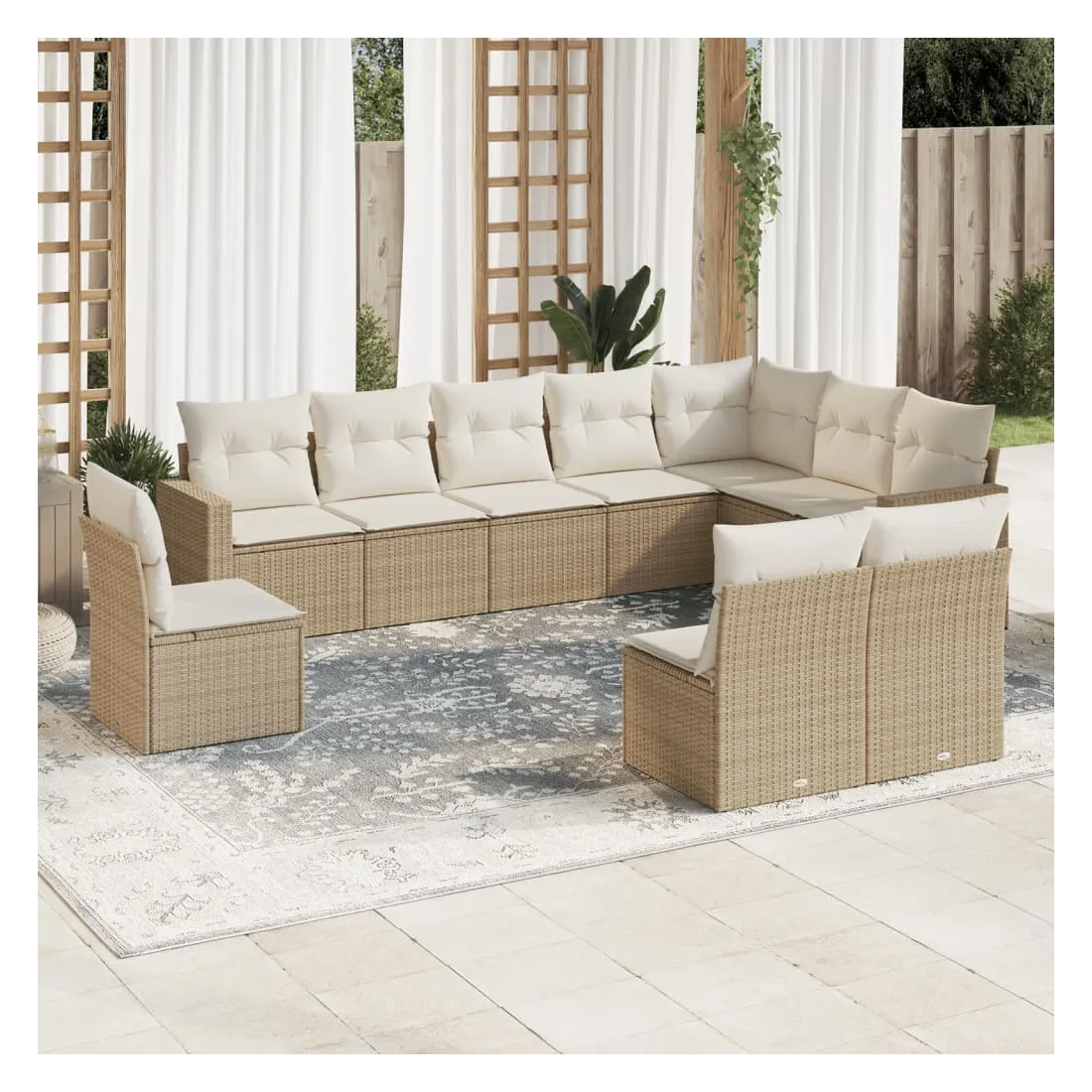 Cet ensemble de canapés de jardin est le complément parfait de votre arrière-cour, terrasse ou patio, offrant un espace confortable et accueillant pour discuter avec la famille et les amis ou simplement se détendre et profiter de l'extérieur. Matériau durable : la résine tressée, également connue sous le nom de poly rotin, est un matériau synthétique solide et nécessitant peu d'entretien qui ressemble au rotin naturel. Il est léger, facile à nettoyer et couramment utilisé pour les meubles d'extérieur en raison de sa durabilité et de ses propriétés de résistance aux intempéries.Expérience d'assise confortable : ce mobilier d'extérieur, doté de coussins épais, offre une expérience d'assise confortable. Les larges accoudoirs offrent également un endroit pratique pour garder votre téléphone portable, vos tasses ou d'autres petits objets à portée de main.Housse amovible et lavable : ces coussins de siège sont dotés de housses amovibles pour un lavage et un entretien faciles.Conception modulaire : cet ensemble de meubles d'extérieur a une conception modulaire, ce qui le rend complètement flexible et facile à déplacer, afin que vous puissiez créer un agencement de meubles d'extérieur personnalisé. Bon à savoir :Pour que vos meubles d'extérieur restent beaux, nous vous recommandons de les protéger avec une housse imperméable.