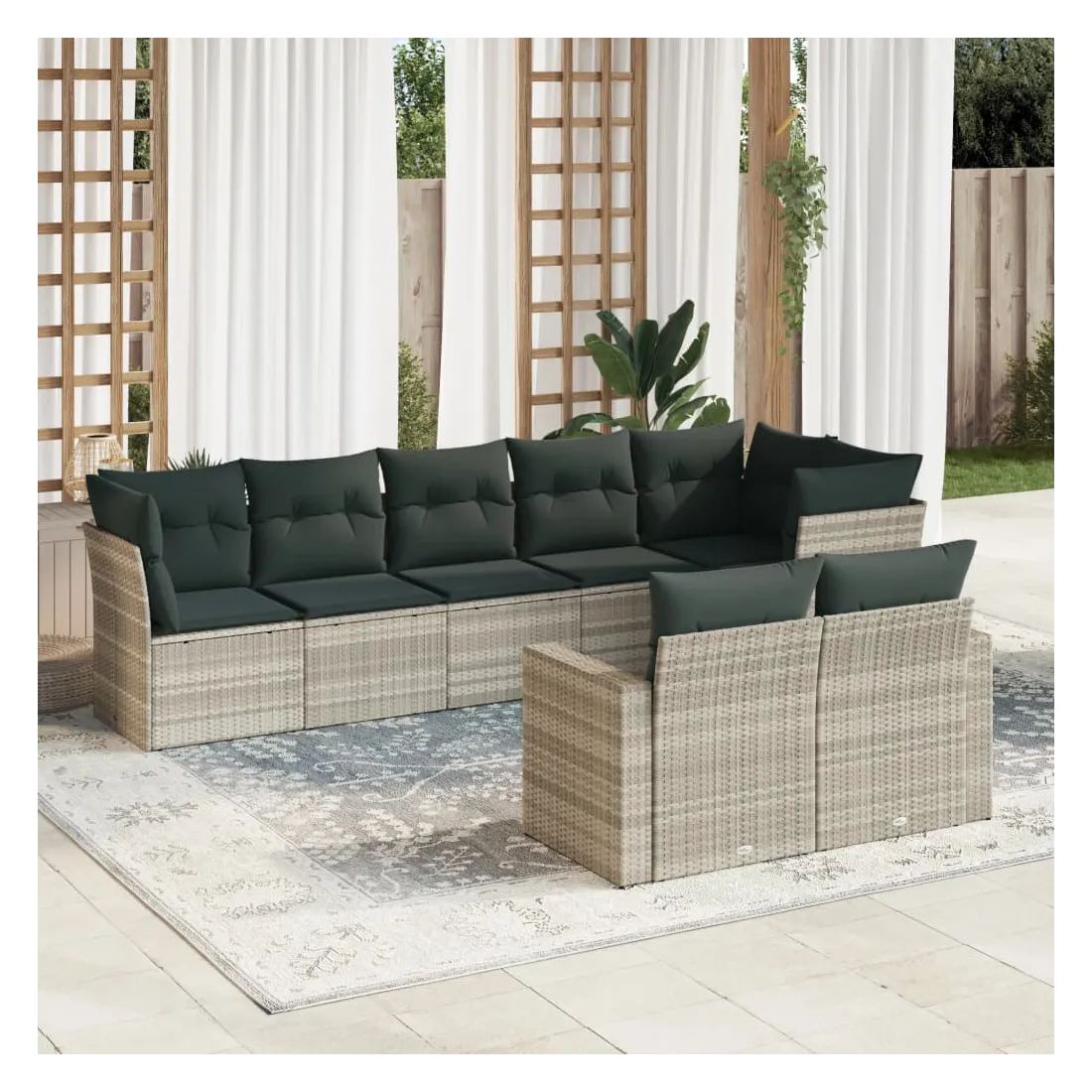 Cet ensemble de canapés de jardin est le complément parfait de votre arrière-cour, terrasse ou patio, offrant un espace confortable et accueillant pour discuter avec la famille et les amis ou simplement se détendre et profiter de l'extérieur. Matériau durable : la résine tressée, également connue sous le nom de poly rotin, est un matériau synthétique solide et nécessitant peu d'entretien qui ressemble au rotin naturel. Il est léger, facile à nettoyer et couramment utilisé pour les meubles d'extérieur en raison de sa durabilité et de ses propriétés de résistance aux intempéries.Expérience d'assise confortable : ce mobilier d'extérieur, doté de coussins épais, offre une expérience d'assise confortable. Les larges accoudoirs offrent également un endroit pratique pour garder votre téléphone portable, vos tasses ou d'autres petits objets à portée de main.Housse amovible et lavable : ces coussins de siège sont dotés de housses amovibles pour un lavage et un entretien faciles.Conception modulaire : cet ensemble de meubles d'extérieur a une conception modulaire, ce qui le rend complètement flexible et facile à déplacer, afin que vous puissiez créer un agencement de meubles d'extérieur personnalisé. Bon à savoir :Pour que vos meubles d'extérieur restent beaux, nous vous recommandons de les protéger avec une housse imperméable.