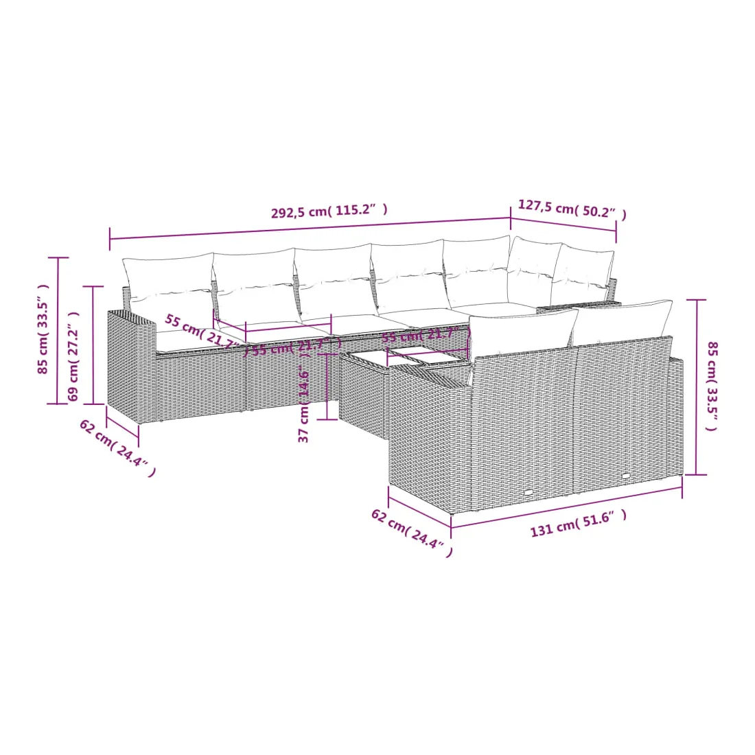 • 8 x coussin d'assise avec housse amovible et lavable