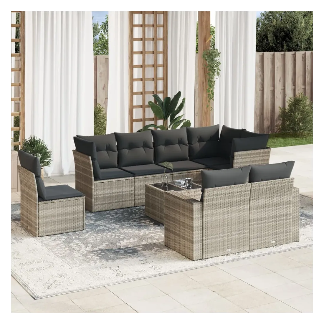 Cet ensemble de canapés de jardin est le complément parfait de votre arrière-cour, terrasse ou patio, offrant un espace confortable et accueillant pour discuter avec la famille et les amis ou simplement se détendre et profiter de l'extérieur. Matériau durable : la résine tressée, également connue sous le nom de poly rotin, est un matériau synthétique solide et nécessitant peu d'entretien qui ressemble au rotin naturel. Il est léger, facile à nettoyer et couramment utilisé pour les meubles d'extérieur en raison de sa durabilité et de ses propriétés de résistance aux intempéries.Expérience d'assise confortable : ce mobilier d'extérieur, doté de coussins épais, offre une expérience d'assise confortable. Les larges accoudoirs offrent également un endroit pratique pour garder votre téléphone portable, vos tasses ou d'autres petits objets à portée de main.Housse amovible et lavable : ces coussins de siège sont dotés de housses amovibles pour un lavage et un entretien faciles.Dessus en verre : le dessus de la table d'extérieur est fabriqué en verre trempé solide et durable, ce qui le rend facile à nettoyer avec un chiffon humide et ajoute une touche d'élégance à votre espace extérieur.Conception modulaire : cet ensemble de meubles d'extérieur a une conception modulaire, ce qui le rend complètement flexible et facile à déplacer, afin que vous puissiez créer un agencement de meubles d'extérieur personnalisé. Bon à savoir :Pour que vos meubles d'extérieur restent beaux, nous vous recommandons de les protéger avec une housse imperméable.