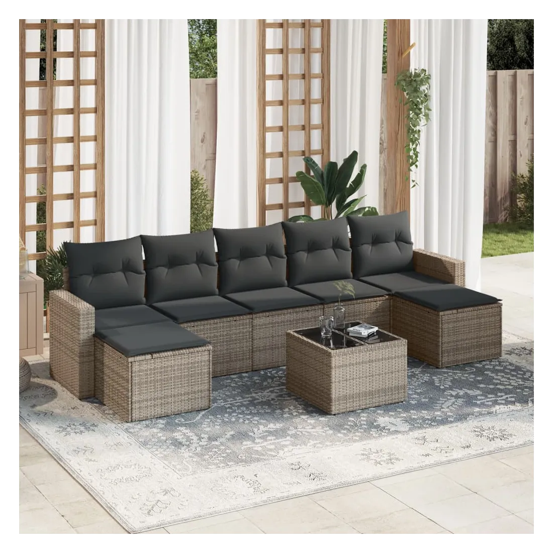 Cet ensemble de canapés de jardin est le complément parfait de votre arrière-cour, terrasse ou patio, offrant un espace confortable et accueillant pour discuter avec la famille et les amis ou simplement se détendre et profiter de l'extérieur. Matériau durable : la résine tressée, également connue sous le nom de poly rotin, est un matériau synthétique solide et nécessitant peu d'entretien qui ressemble au rotin naturel. Il est léger, facile à nettoyer et couramment utilisé pour les meubles d'extérieur en raison de sa durabilité et de ses propriétés de résistance aux intempéries.Expérience d'assise confortable : ce mobilier d'extérieur, doté de coussins épais, offre une expérience d'assise confortable. Les larges accoudoirs offrent également un endroit pratique pour garder votre téléphone portable, vos tasses ou d'autres petits objets à portée de main.Housse amovible et lavable : ces coussins de siège sont dotés de housses amovibles pour un lavage et un entretien faciles.Dessus en verre : le dessus de la table d'extérieur est fabriqué en verre trempé solide et durable, ce qui le rend facile à nettoyer avec un chiffon humide et ajoute une touche d'élégance à votre espace extérieur.Conception modulaire : cet ensemble de meubles d'extérieur a une conception modulaire, ce qui le rend complètement flexible et facile à déplacer, afin que vous puissiez créer un agencement de meubles d'extérieur personnalisé. Bon à savoir :Pour que vos meubles d'extérieur restent beaux, nous vous recommandons de les protéger avec une housse imperméable.