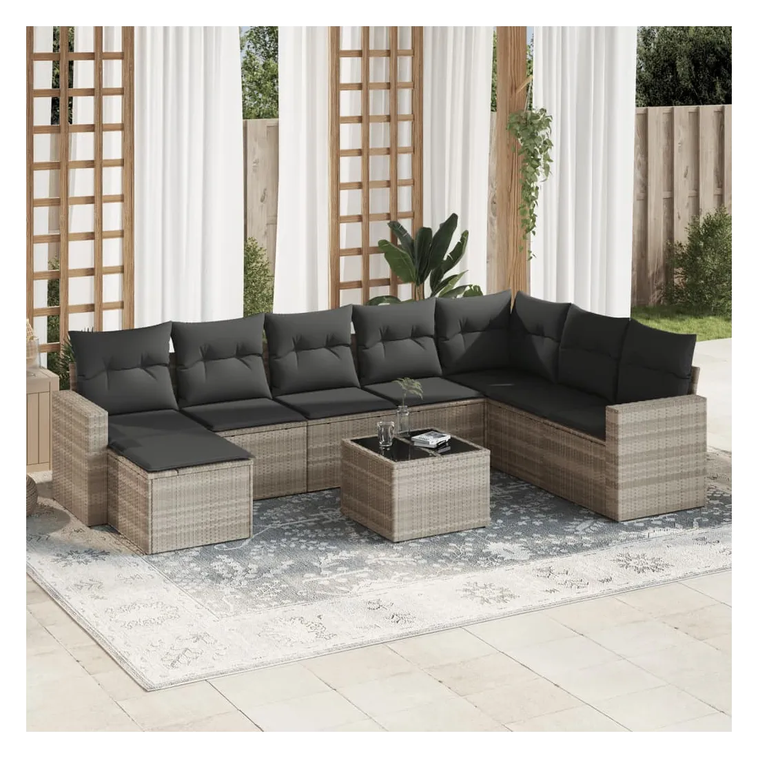 Cet ensemble de canapés de jardin est le complément parfait de votre arrière-cour, terrasse ou patio, offrant un espace confortable et accueillant pour discuter avec la famille et les amis ou simplement se détendre et profiter de l'extérieur. Matériau durable : la résine tressée, également connue sous le nom de poly rotin, est un matériau synthétique solide et nécessitant peu d'entretien qui ressemble au rotin naturel. Il est léger, facile à nettoyer et couramment utilisé pour les meubles d'extérieur en raison de sa durabilité et de ses propriétés de résistance aux intempéries.Expérience d'assise confortable : ce mobilier d'extérieur, doté de coussins épais, offre une expérience d'assise confortable. Les larges accoudoirs offrent également un endroit pratique pour garder votre téléphone portable, vos tasses ou d'autres petits objets à portée de main.Housse amovible et lavable : ces coussins de siège sont dotés de housses amovibles pour un lavage et un entretien faciles.Dessus en verre : le dessus de la table d'extérieur est fabriqué en verre trempé solide et durable, ce qui le rend facile à nettoyer avec un chiffon humide et ajoute une touche d'élégance à votre espace extérieur.Conception modulaire : cet ensemble de meubles d'extérieur a une conception modulaire, ce qui le rend complètement flexible et facile à déplacer, afin que vous puissiez créer un agencement de meubles d'extérieur personnalisé. Bon à savoir :Pour que vos meubles d'extérieur restent beaux, nous vous recommandons de les protéger avec une housse imperméable.