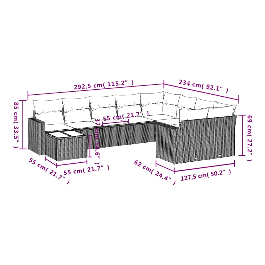 - 9 x coussin d'assise avec housse amovible et lavable