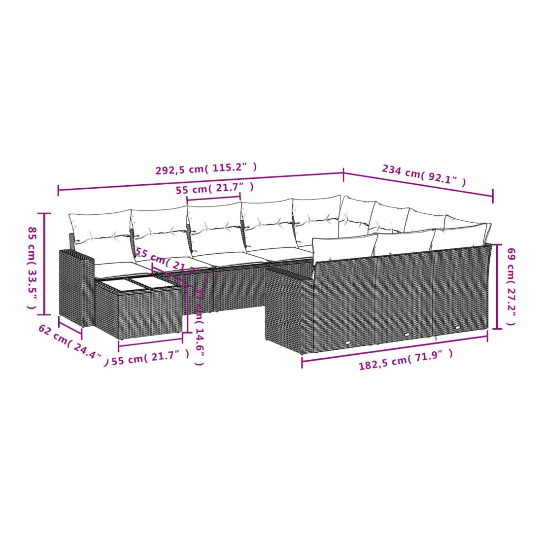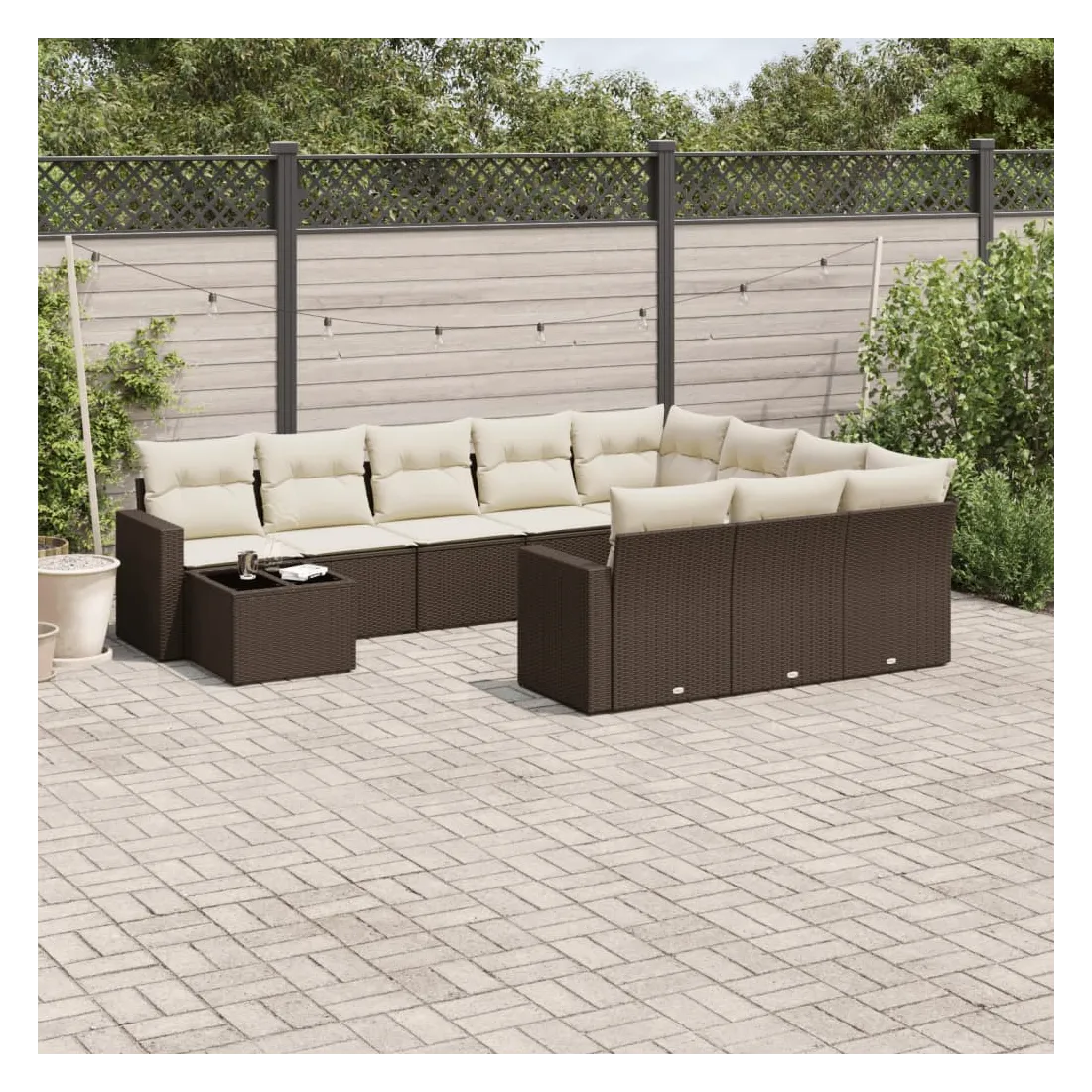 Cet ensemble de canapés de jardin est le complément parfait de votre arrière-cour, terrasse ou patio, offrant un espace confortable et accueillant pour discuter avec la famille et les amis ou simplement se détendre et profiter de l'extérieur. Matériau durable : la résine tressée, également connue sous le nom de poly rotin, est un matériau synthétique solide et nécessitant peu d'entretien qui ressemble au rotin naturel. Il est léger, facile à nettoyer et couramment utilisé pour les meubles d'extérieur en raison de sa durabilité et de ses propriétés de résistance aux intempéries.Dessus en verre : le dessus de la table d'extérieur est fabriqué en verre trempé solide et durable, ce qui le rend facile à nettoyer avec un chiffon humide et ajoute une touche d'élégance à votre espace extérieur. Expérience d'assise confortable : ce mobilier d'extérieur, doté de coussins épais, offre une expérience d'assise confortable. Housse amovible et lavable : ces coussins de siège sont dotés de housses amovibles pour un lavage et un entretien faciles.Conception modulaire : cet ensemble de meubles d'extérieur a une conception modulaire, ce qui le rend complètement flexible et facile à déplacer, afin que vous puissiez créer un agencement de meubles d'extérieur personnalisé. Bon à savoir :Pour que vos meubles d'extérieur restent beaux, nous vous recommandons de les protéger avec une housse imperméable.