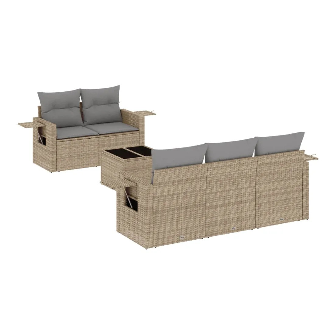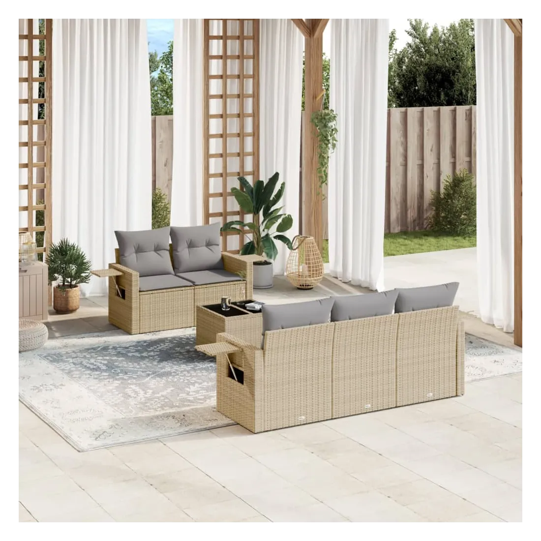 Cet ensemble de canapés de jardin est le complément parfait de votre arrière-cour, terrasse ou patio, offrant un espace confortable et accueillant pour discuter avec la famille et les amis ou simplement se détendre et profiter de l'extérieur. Matériau durable : la résine tressée, également connue sous le nom de poly rotin, est un matériau synthétique solide et nécessitant peu d'entretien qui ressemble au rotin naturel. Il est léger, facile à nettoyer et couramment utilisé pour les meubles d'extérieur en raison de sa durabilité et de ses propriétés de résistance aux intempéries.Dessus en verre : le dessus de la table d'extérieur est fabriqué en verre trempé solide et durable, ce qui le rend facile à nettoyer avec un chiffon humide et ajoute une touche d'élégance à votre espace extérieur. Table d'appoint pratique : ce mobilier d'extérieur comprend des tables d'appoint pliables avec un ressort à gaz sur les accoudoirs, offrant des endroits pratiques pour garder vos essentiels à portée de main. Expérience d'assise confortable : ce mobilier d'extérieur, doté de coussins épais, offre une expérience d'assise confortable.Conception modulaire : cet ensemble de meubles d'extérieur a une conception modulaire, ce qui le rend complètement flexible et facile à déplacer, afin que vous puissiez créer un agencement de meubles d'extérieur personnalisé. Bon à savoir :Pour que vos meubles d'extérieur restent beaux, nous vous recommandons de les protéger avec une housse imperméable.