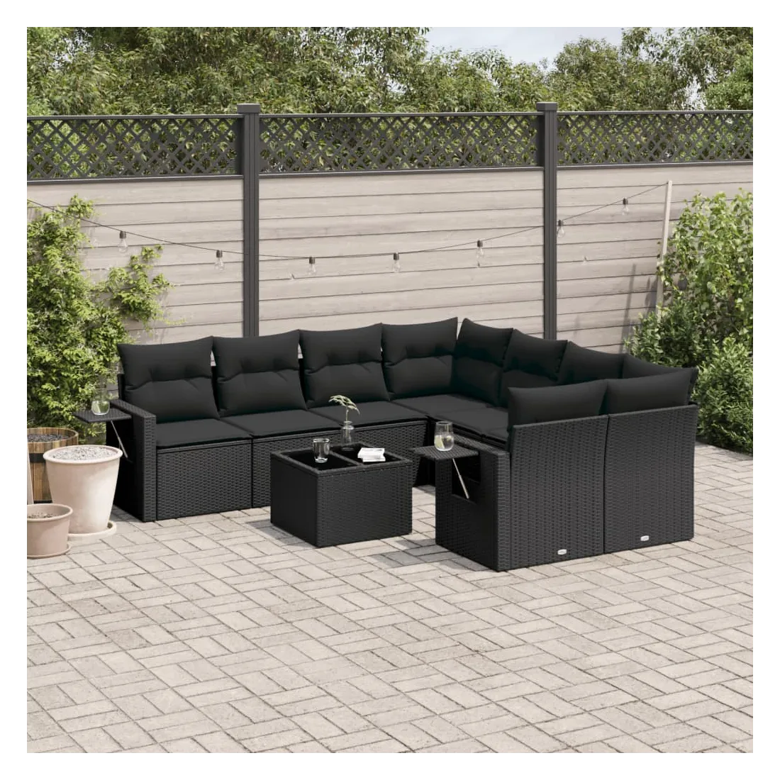 Cet ensemble de canapés de jardin est le complément parfait de votre arrière-cour, terrasse ou patio, offrant un espace confortable et accueillant pour discuter avec la famille et les amis ou simplement se détendre et profiter de l'extérieur. Matériau durable : la résine tressée, également connue sous le nom de poly rotin, est un matériau synthétique solide et nécessitant peu d'entretien qui ressemble au rotin naturel. Il est léger, facile à nettoyer et couramment utilisé pour les meubles d'extérieur en raison de sa durabilité et de ses propriétés de résistance aux intempéries.Dessus en verre : le dessus de la table d'extérieur est fabriqué en verre trempé solide et durable, ce qui le rend facile à nettoyer avec un chiffon humide et ajoute une touche d'élégance à votre espace extérieur. Table d'appoint pratique : ce mobilier d'extérieur comprend des tables d'appoint pliables avec un ressort à gaz sur les accoudoirs, offrant des endroits pratiques pour garder vos essentiels à portée de main. Expérience d'assise confortable : ce mobilier d'extérieur, doté de coussins épais, offre une expérience d'assise confortable.Conception modulaire : cet ensemble de meubles d'extérieur a une conception modulaire, ce qui le rend complètement flexible et facile à déplacer, afin que vous puissiez créer un agencement de meubles d'extérieur personnalisé. Bon à savoir :Pour que vos meubles d'extérieur restent beaux, nous vous recommandons de les protéger avec une housse imperméable.