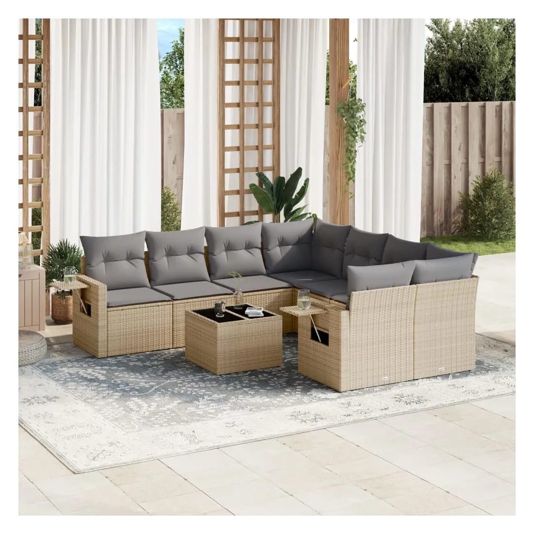 Cet ensemble de canapés de jardin est le complément parfait de votre arrière-cour, terrasse ou patio, offrant un espace confortable et accueillant pour discuter avec la famille et les amis ou simplement se détendre et profiter de l'extérieur. Matériau durable : la résine tressée, également connue sous le nom de poly rotin, est un matériau synthétique solide et nécessitant peu d'entretien qui ressemble au rotin naturel. Il est léger, facile à nettoyer et couramment utilisé pour les meubles d'extérieur en raison de sa durabilité et de ses propriétés de résistance aux intempéries.Dessus en verre : le dessus de la table d'extérieur est fabriqué en verre trempé solide et durable, ce qui le rend facile à nettoyer avec un chiffon humide et ajoute une touche d'élégance à votre espace extérieur. Table d'appoint pratique : ce mobilier d'extérieur comprend des tables d'appoint pliables avec un ressort à gaz sur les accoudoirs, offrant des endroits pratiques pour garder vos essentiels à portée de main. Expérience d'assise confortable : ce mobilier d'extérieur, doté de coussins épais, offre une expérience d'assise confortable.Conception modulaire : cet ensemble de meubles d'extérieur a une conception modulaire, ce qui le rend complètement flexible et facile à déplacer, afin que vous puissiez créer un agencement de meubles d'extérieur personnalisé. Bon à savoir :Pour que vos meubles d'extérieur restent beaux, nous vous recommandons de les protéger avec une housse imperméable.