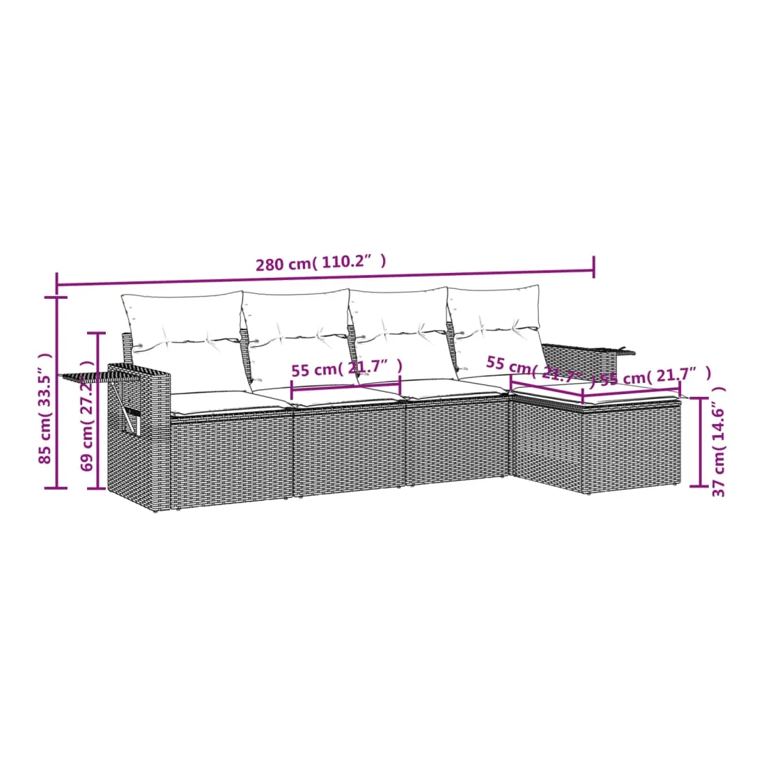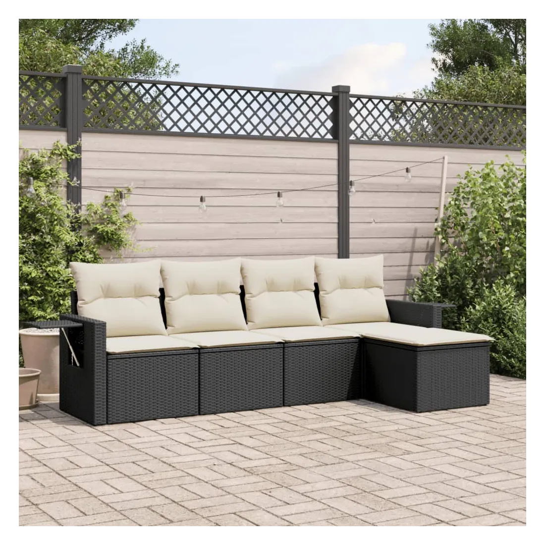 Cet ensemble de canapés de jardin est le complément parfait de votre arrière-cour, terrasse ou patio, offrant un espace confortable et accueillant pour discuter avec la famille et les amis ou simplement se détendre et profiter de l'extérieur. Matériau durable : la résine tressée, également connue sous le nom de poly rotin, est un matériau synthétique solide et nécessitant peu d'entretien qui ressemble au rotin naturel. Il est léger, facile à nettoyer et couramment utilisé pour les meubles d'extérieur en raison de sa durabilité et de ses propriétés de résistance aux intempéries. Table d'appoint pratique : ce mobilier d'extérieur comprend des tables d'appoint pliables avec un ressort à gaz sur les accoudoirs, offrant des endroits pratiques pour garder vos essentiels à portée de main. Expérience d'assise confortable : ce mobilier d'extérieur, doté de coussins épais, offre une expérience d'assise confortable. Housse amovible et lavable : ces coussins de siège sont dotés de housses amovibles pour un lavage et un entretien faciles.Conception modulaire : cet ensemble de meubles d'extérieur a une conception modulaire, ce qui le rend complètement flexible et facile à déplacer, afin que vous puissiez créer un agencement de meubles d'extérieur personnalisé. Bon à savoir :Pour que vos meubles d'extérieur restent beaux, nous vous recommandons de les protéger avec une housse imperméable.