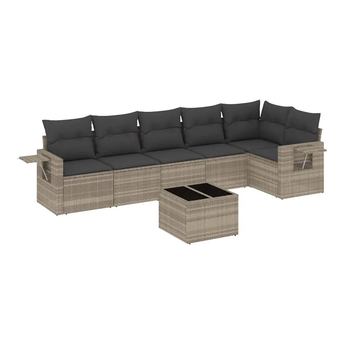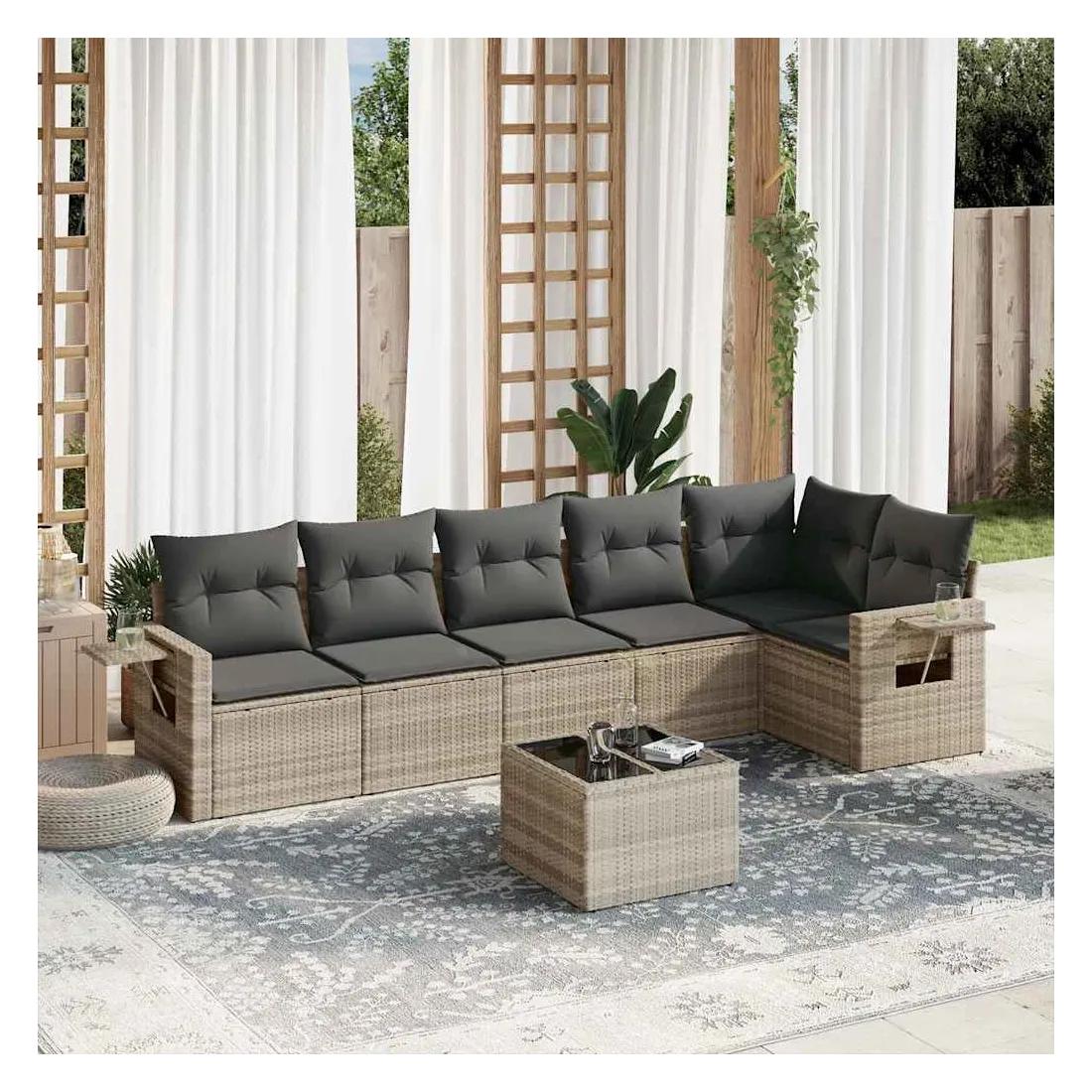 Cet ensemble de canapés de jardin est le complément parfait de votre arrière-cour, terrasse ou patio, offrant un espace confortable et accueillant pour discuter avec la famille et les amis ou simplement se détendre et profiter de l'extérieur. Matériau durable : la résine tressée, également connue sous le nom de poly rotin, est un matériau synthétique solide et nécessitant peu d'entretien qui ressemble au rotin naturel. Il est léger, facile à nettoyer et couramment utilisé pour les meubles d'extérieur en raison de sa durabilité et de ses propriétés de résistance aux intempéries.Dessus en verre : le dessus de la table d'extérieur est fabriqué en verre trempé solide et durable, ce qui le rend facile à nettoyer avec un chiffon humide et ajoute une touche d'élégance à votre espace extérieur. Table d'appoint pratique : ce mobilier d'extérieur comprend des tables d'appoint pliables avec un ressort à gaz sur les accoudoirs, offrant des endroits pratiques pour garder vos essentiels à portée de main. Expérience d'assise confortable : ce mobilier d'extérieur, doté de coussins épais, offre une expérience d'assise confortable.Conception modulaire : cet ensemble de meubles d'extérieur a une conception modulaire, ce qui le rend complètement flexible et facile à déplacer, afin que vous puissiez créer un agencement de meubles d'extérieur personnalisé. Bon à savoir :Pour que vos meubles d'extérieur restent beaux, nous vous recommandons de les protéger avec une housse imperméable.
