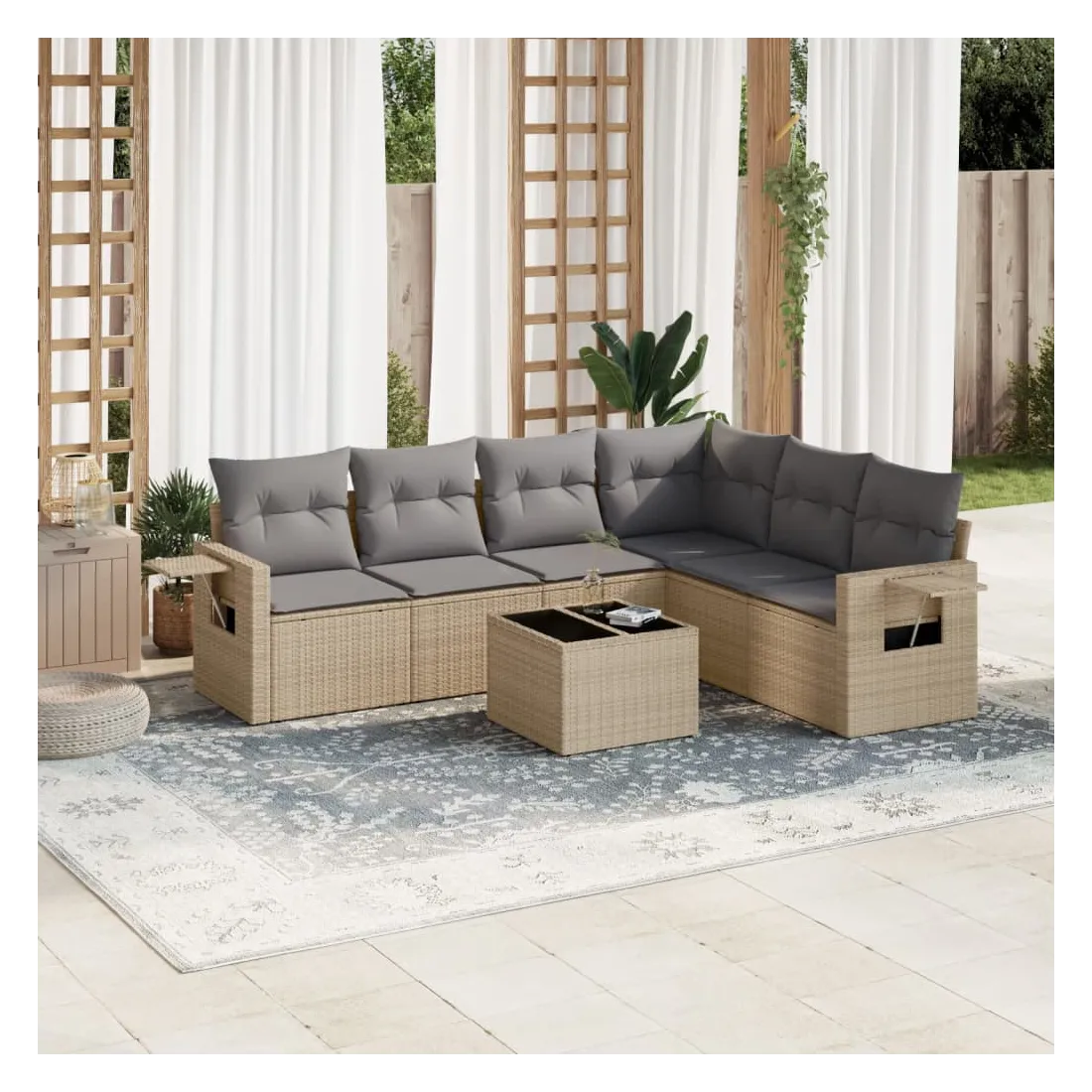 Cet ensemble de canapés de jardin est le complément parfait de votre arrière-cour, terrasse ou patio, offrant un espace confortable et accueillant pour discuter avec la famille et les amis ou simplement se détendre et profiter de l'extérieur. Matériau durable : la résine tressée, également connue sous le nom de poly rotin, est un matériau synthétique solide et nécessitant peu d'entretien qui ressemble au rotin naturel. Il est léger, facile à nettoyer et couramment utilisé pour les meubles d'extérieur en raison de sa durabilité et de ses propriétés de résistance aux intempéries.Dessus en verre : le dessus de la table d'extérieur est fabriqué en verre trempé solide et durable, ce qui le rend facile à nettoyer avec un chiffon humide et ajoute une touche d'élégance à votre espace extérieur. Table d'appoint pratique : ce mobilier d'extérieur comprend des tables d'appoint pliables avec un ressort à gaz sur les accoudoirs, offrant des endroits pratiques pour garder vos essentiels à portée de main. Expérience d'assise confortable : ce mobilier d'extérieur, doté de coussins épais, offre une expérience d'assise confortable.Conception modulaire : cet ensemble de meubles d'extérieur a une conception modulaire, ce qui le rend complètement flexible et facile à déplacer, afin que vous puissiez créer un agencement de meubles d'extérieur personnalisé. Bon à savoir :Pour que vos meubles d'extérieur restent beaux, nous vous recommandons de les protéger avec une housse imperméable.