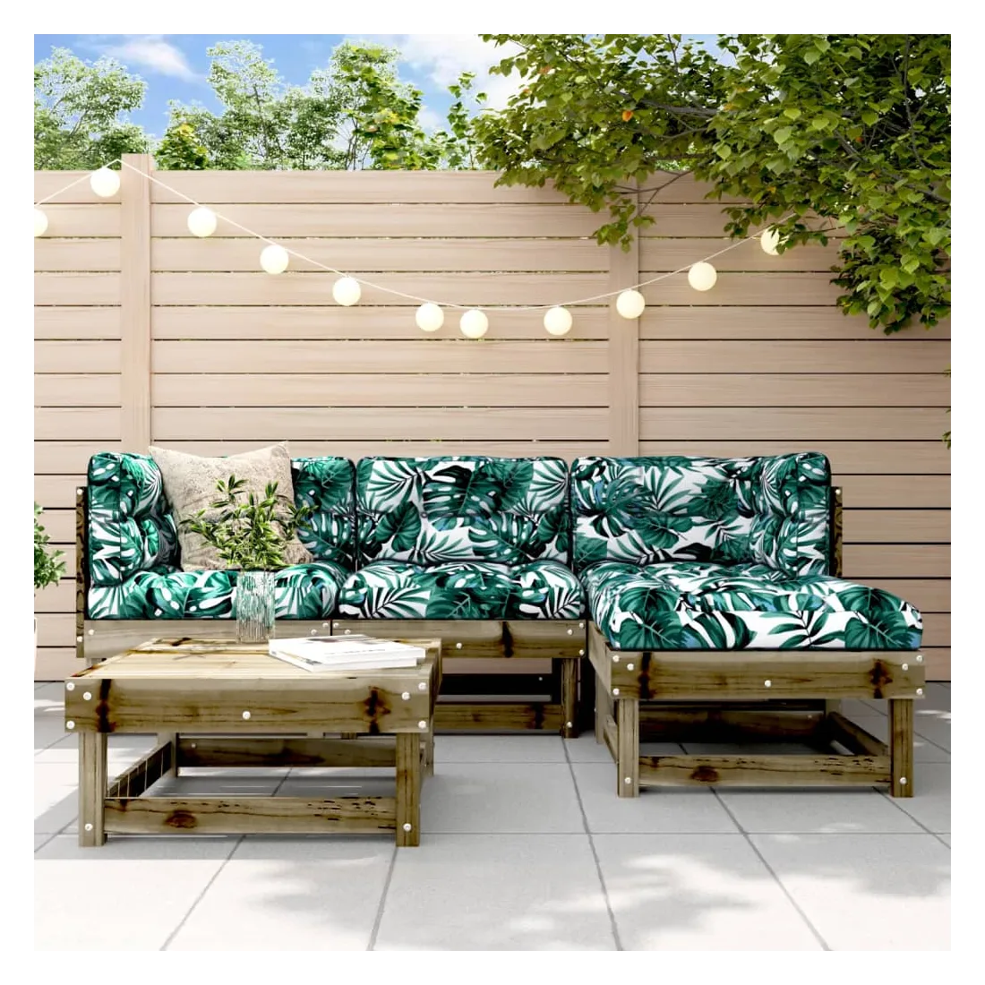 Ce salon de jardin en bois, qui se démarque par son design à lattes, sera un excellent supplément à votre jardin, patio ou terrasse pour profiter d'un moment agréable avec votre famille ou vos amis. Bois imprégné : le bois de pin massif est un matériau naturel magnifique. Le bois de pin a un grain droit et les nœuds lui confèrent un aspect rustique caractéristique. L'imprégnation est un processus de conservation réalisé à l'aide d'autoclaves. Le traitement sous pression augmente la résistance à la pourriture et aux intempéries.Cadre robuste et stable : les cadres en bois rendent l'ensemble de salon robuste et stable pour une utilisation quotidienne à l'extérieur.Design modulaire : le canapé est flexible et facile à déplacer. Vous pouvez le combiner avec d'autres segments modulaires de la boutique en ligne pour créer vos propres configurations de salon de jardin ! Bon à savoir :Pour que vos meubles d'extérieur restent beaux, nous vous recommandons de les protéger avec une housse imperméable.Les coussins ne sont pas inclus dans la livraison.