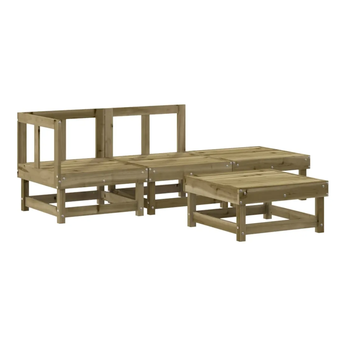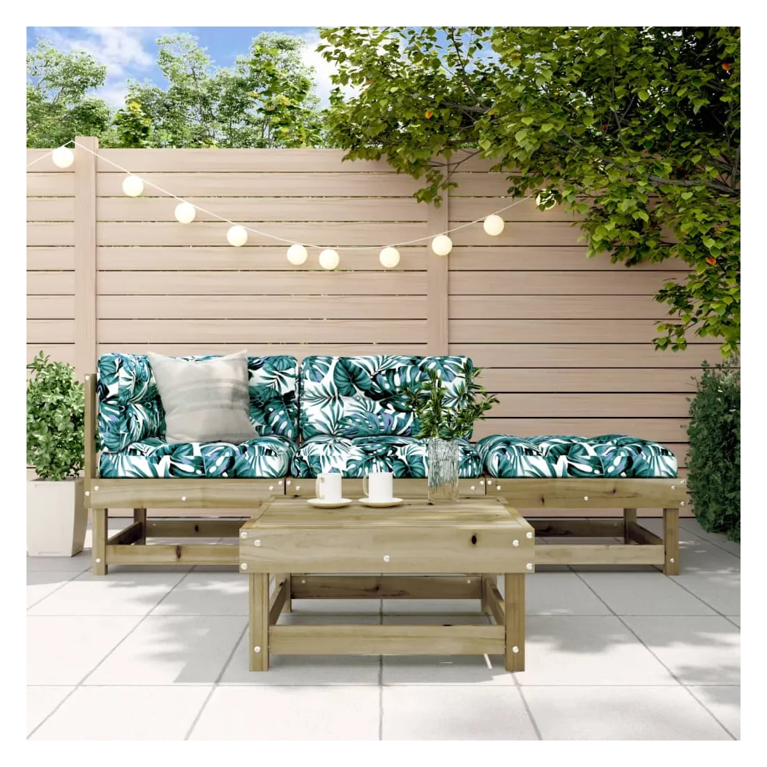 Ce salon de jardin en bois, qui se démarque par son design à lattes, sera un excellent supplément à votre jardin, patio ou terrasse pour profiter d'un moment agréable avec votre famille ou vos amis. Bois imprégné : le bois de pin massif est un matériau naturel magnifique. Le bois de pin a un grain droit et les nœuds lui confèrent un aspect rustique caractéristique. L'imprégnation est un processus de conservation réalisé à l'aide d'autoclaves. Le traitement sous pression augmente la résistance à la pourriture et aux intempéries.Cadre robuste et stable : les cadres en bois rendent l'ensemble de salon robuste et stable pour une utilisation quotidienne à l'extérieur.Design modulaire : le canapé est flexible et facile à déplacer. Vous pouvez le combiner avec d'autres segments modulaires de la boutique en ligne pour créer vos propres configurations de salon de jardin ! Bon à savoir :Pour que vos meubles d'extérieur restent beaux, nous vous recommandons de les protéger avec une housse imperméable.Les coussins ne sont pas inclus dans la livraison.