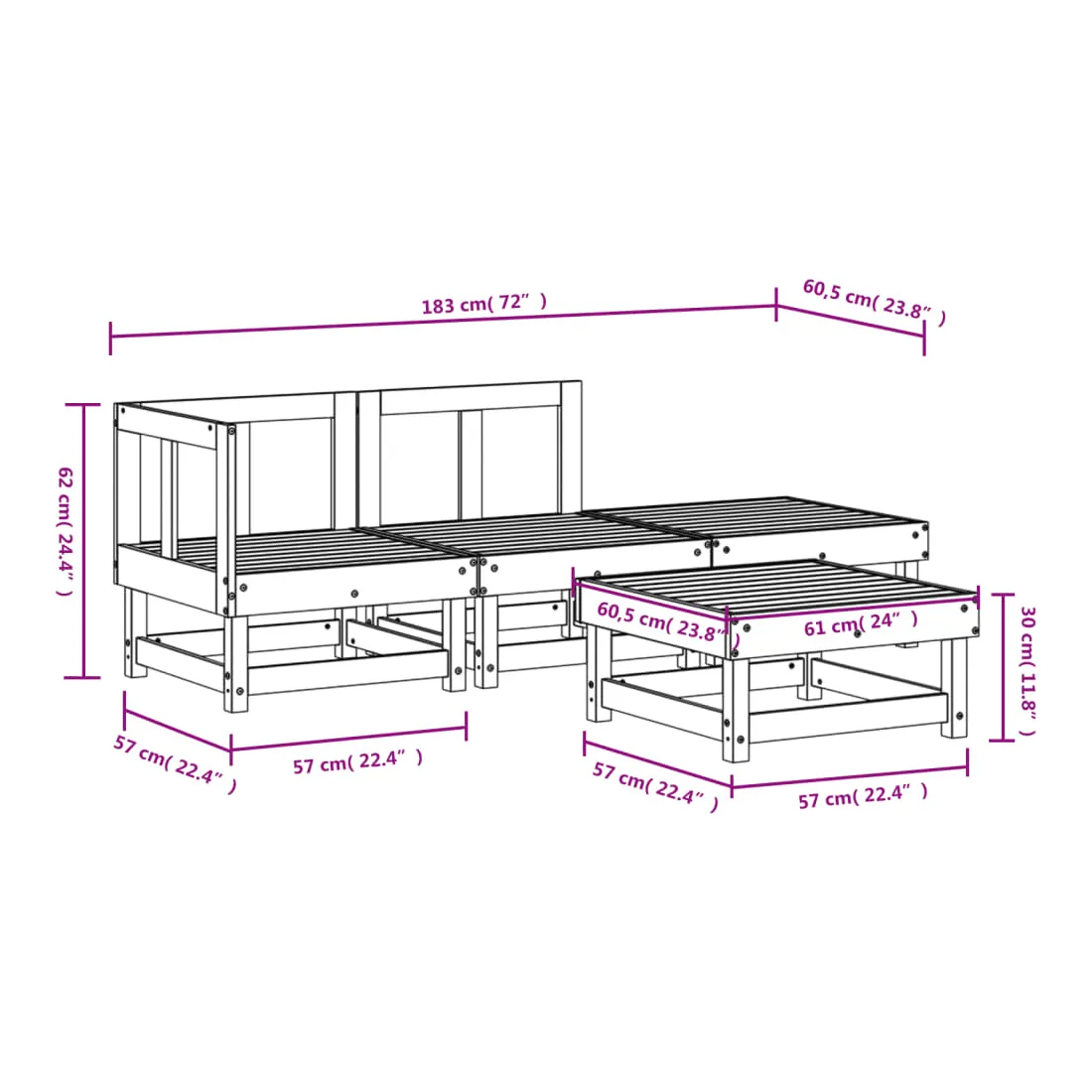 - Dimensions du canapé central : 61 x 60,5 x 62 cm (l x P x H)