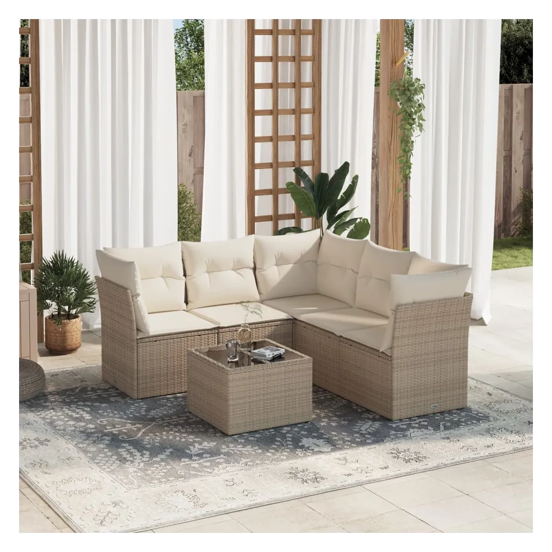 Cet ensemble de canapés de jardin est le complément parfait de votre arrière-cour, terrasse ou patio, offrant un espace confortable et accueillant pour discuter avec la famille et les amis ou simplement se détendre et profiter de l'extérieur. Matériau durable : la résine tressée, également connue sous le nom de poly rotin, est un matériau synthétique solide et nécessitant peu d'entretien qui ressemble au rotin naturel. Il est léger, facile à nettoyer et couramment utilisé pour les meubles d'extérieur en raison de sa durabilité et de ses propriétés de résistance aux intempéries.Expérience d'assise confortable : cet ensemble de meubles d'extérieur, doté de coussins épais, offre une expérience d'assise confortable.Housse amovible et lavable : ces coussins de siège sont dotés de housses amovibles pour un lavage et un entretien faciles.Dessus en verre : le dessus de la table d'extérieur est fabriqué en verre trempé solide et durable, ce qui le rend facile à nettoyer avec un chiffon humide et ajoute une touche d'élégance à votre espace extérieur.Conception modulaire : cet ensemble de meubles d'extérieur a une conception modulaire, ce qui le rend complètement flexible et facile à déplacer, afin que vous puissiez créer un agencement de meubles d'extérieur personnalisé. Bon à savoir :Pour que vos meubles d'extérieur restent beaux, nous vous recommandons de les protéger avec une housse imperméable.