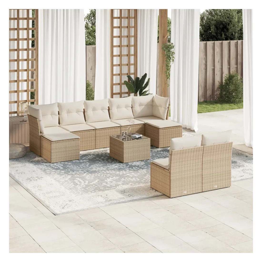 Cet ensemble de canapés de jardin est le complément parfait de votre arrière-cour, terrasse ou patio, offrant un espace confortable et accueillant pour discuter avec la famille et les amis ou simplement se détendre et profiter de l'extérieur. Matériau durable : la résine tressée, également connue sous le nom de poly rotin, est un matériau synthétique solide et nécessitant peu d'entretien qui ressemble au rotin naturel. Il est léger, facile à nettoyer et couramment utilisé pour les meubles d'extérieur en raison de sa durabilité et de ses propriétés de résistance aux intempéries.Expérience d'assise confortable : ce mobilier d'extérieur, doté de coussins épais, offre une expérience d'assise confortable.Dessus en verre : le dessus de la table d'extérieur est fabriqué en verre trempé solide et durable, ce qui le rend facile à nettoyer avec un chiffon humide et ajoute une touche d'élégance à votre espace extérieur.Housse amovible et lavable : ces coussins de siège sont dotés de housses amovibles pour un lavage et un entretien faciles.Conception modulaire : cet ensemble de meubles d'extérieur a une conception modulaire, ce qui le rend complètement flexible et facile à déplacer, afin que vous puissiez créer un agencement de meubles d'extérieur personnalisé. Bon à savoir :Pour que vos meubles d'extérieur restent beaux, nous vous recommandons de les protéger avec une housse imperméable.