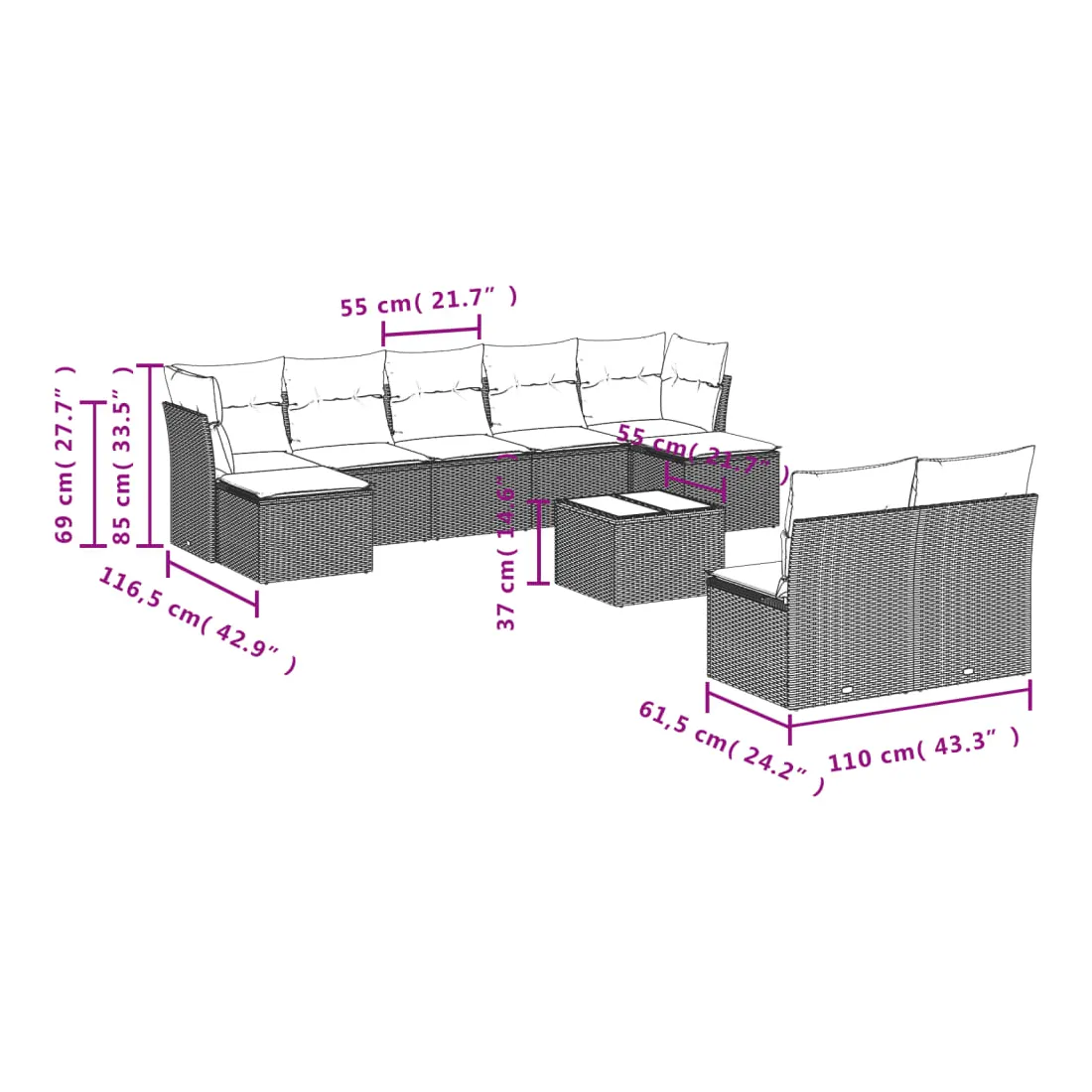 - 9 x coussin d'assise avec housse amovible et lavable