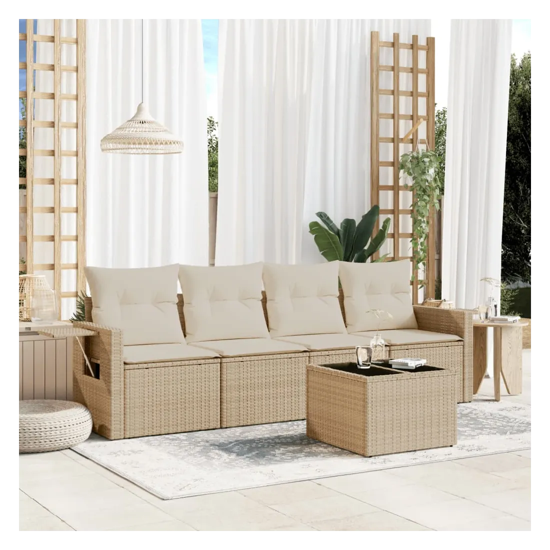 Cet ensemble de canapés de jardin est le complément parfait de votre arrière-cour, terrasse ou patio, offrant un espace confortable et accueillant pour discuter avec la famille et les amis ou simplement se détendre et profiter de l'extérieur. Matériau durable : la résine tressée, également connue sous le nom de poly rotin, est un matériau synthétique solide et nécessitant peu d'entretien qui ressemble au rotin naturel. Il est léger, facile à nettoyer et couramment utilisé pour les meubles d'extérieur en raison de sa durabilité et de ses propriétés de résistance aux intempéries.Dessus en verre : le dessus de la table d'extérieur est fabriqué en verre trempé solide et durable, ce qui le rend facile à nettoyer avec un chiffon humide et ajoute une touche d'élégance à votre espace extérieur. Table d'appoint pratique : ce mobilier d'extérieur comprend des tables d'appoint pliables avec un ressort à gaz sur les accoudoirs, offrant des endroits pratiques pour garder vos essentiels à portée de main. Expérience d'assise confortable : ce mobilier d'extérieur, doté de coussins épais, offre une expérience d'assise confortable.Conception modulaire : cet ensemble de meubles d'extérieur a une conception modulaire, ce qui le rend complètement flexible et facile à déplacer, afin que vous puissiez créer un agencement de meubles d'extérieur personnalisé. Bon à savoir :Pour que vos meubles d'extérieur restent beaux, nous vous recommandons de les protéger avec une housse imperméable.