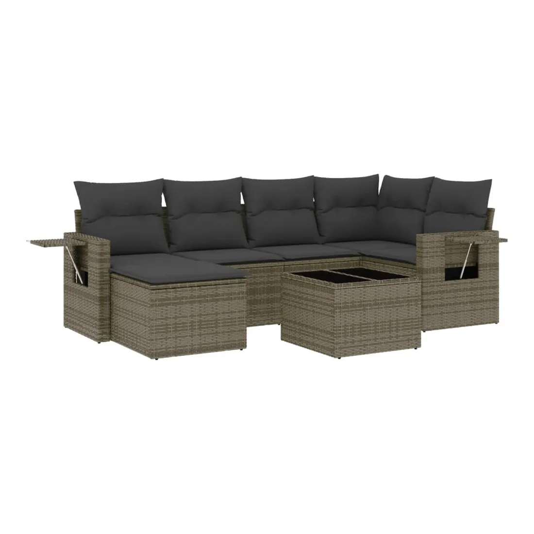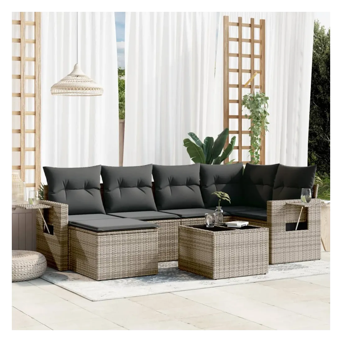 Cet ensemble de canapés de jardin est le complément parfait de votre arrière-cour, terrasse ou patio, offrant un espace confortable et accueillant pour discuter avec la famille et les amis ou simplement se détendre et profiter de l'extérieur. Matériau durable : la résine tressée, également connue sous le nom de poly rotin, est un matériau synthétique solide et nécessitant peu d'entretien qui ressemble au rotin naturel. Il est léger, facile à nettoyer et couramment utilisé pour les meubles d'extérieur en raison de sa durabilité et de ses propriétés de résistance aux intempéries.Dessus en verre : le dessus de la table d'extérieur est fabriqué en verre trempé solide et durable, ce qui le rend facile à nettoyer avec un chiffon humide et ajoute une touche d'élégance à votre espace extérieur. Table d'appoint pratique : ce mobilier d'extérieur comprend des tables d'appoint pliables avec un ressort à gaz sur les accoudoirs, offrant des endroits pratiques pour garder vos essentiels à portée de main. Expérience d'assise confortable : ce mobilier d'extérieur, doté de coussins épais, offre une expérience d'assise confortable.Conception modulaire : cet ensemble de meubles d'extérieur a une conception modulaire, ce qui le rend complètement flexible et facile à déplacer, afin que vous puissiez créer un agencement de meubles d'extérieur personnalisé. Bon à savoir :Pour que vos meubles d'extérieur restent beaux, nous vous recommandons de les protéger avec une housse imperméable.