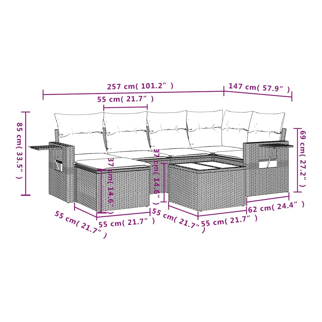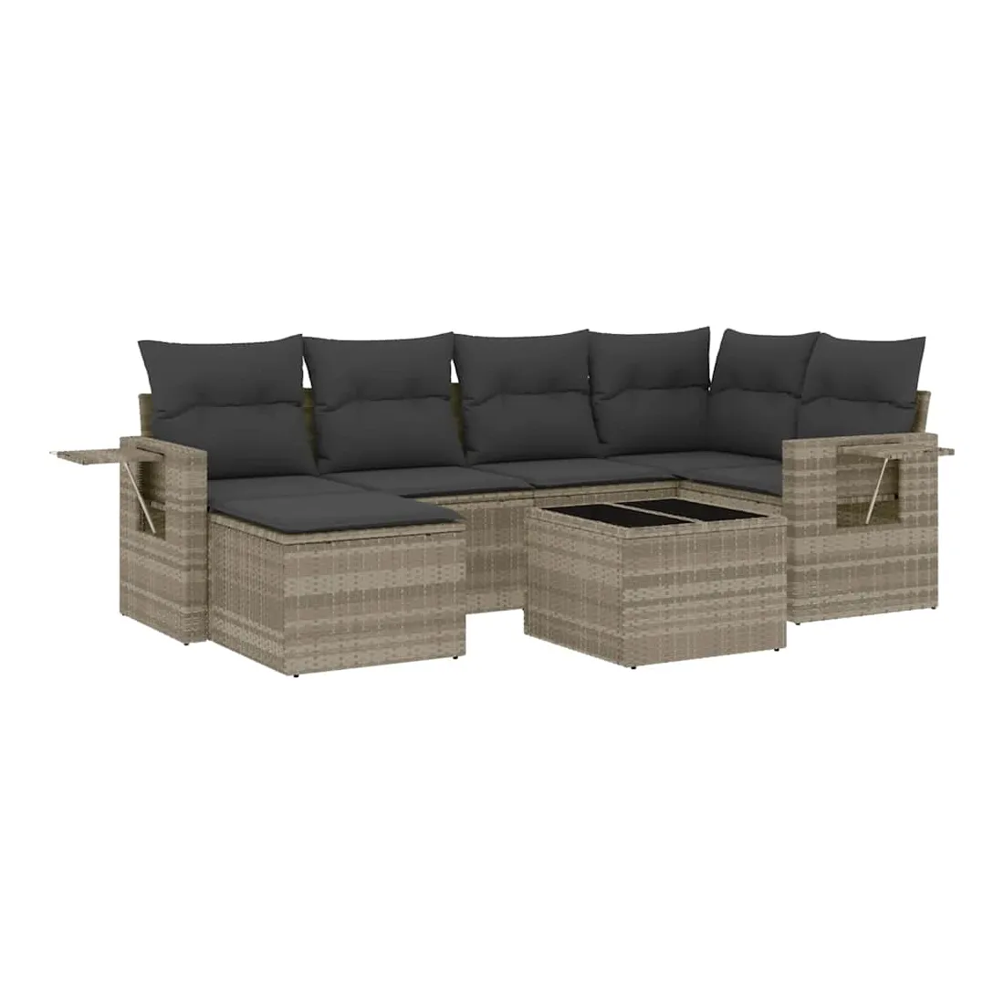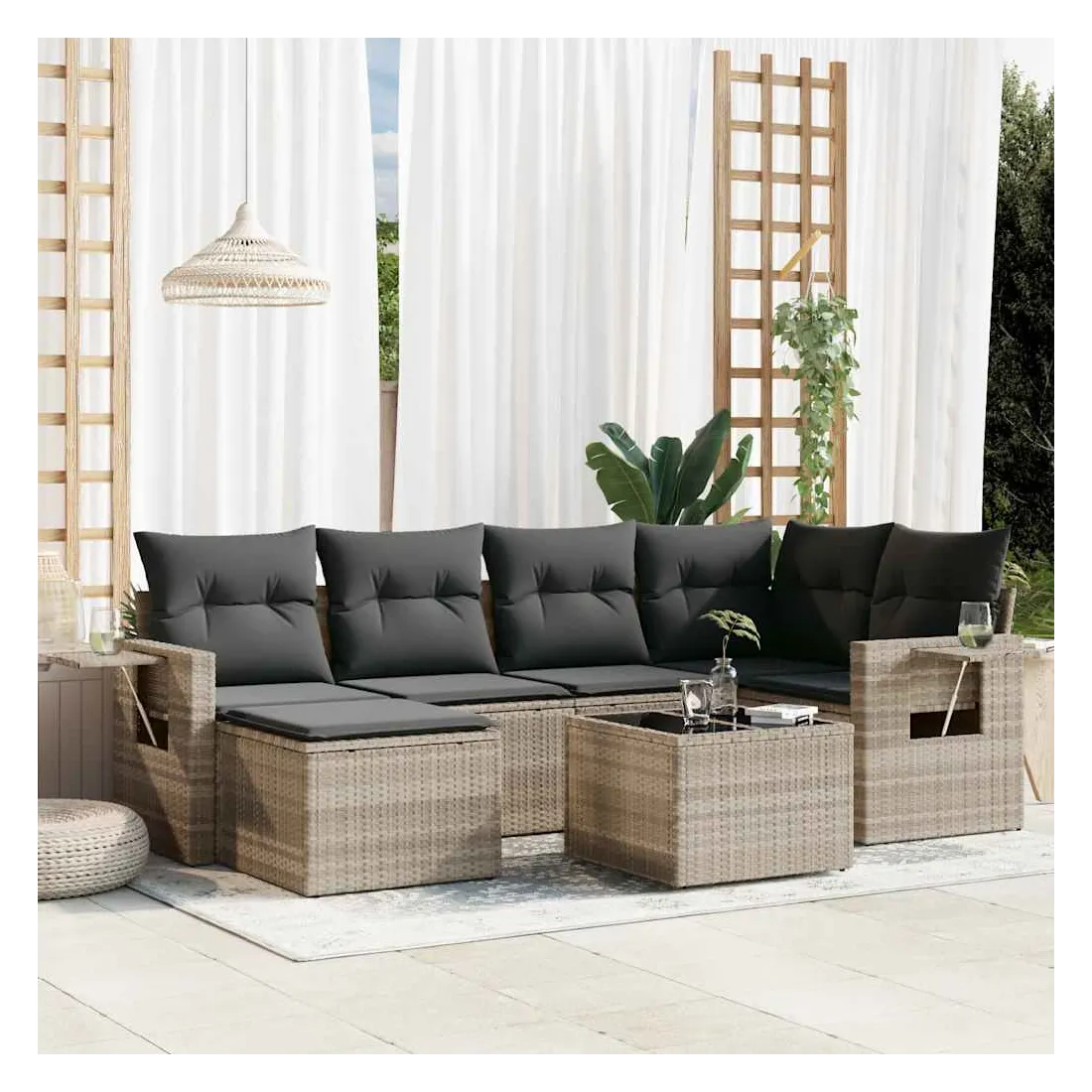 Cet ensemble de canapés de jardin est le complément parfait de votre arrière-cour, terrasse ou patio, offrant un espace confortable et accueillant pour discuter avec la famille et les amis ou simplement se détendre et profiter de l'extérieur. Matériau durable : la résine tressée, également connue sous le nom de poly rotin, est un matériau synthétique solide et nécessitant peu d'entretien qui ressemble au rotin naturel. Il est léger, facile à nettoyer et couramment utilisé pour les meubles d'extérieur en raison de sa durabilité et de ses propriétés de résistance aux intempéries.Dessus en verre : le dessus de la table d'extérieur est fabriqué en verre trempé solide et durable, ce qui le rend facile à nettoyer avec un chiffon humide et ajoute une touche d'élégance à votre espace extérieur. Table d'appoint pratique : ce mobilier d'extérieur comprend des tables d'appoint pliables avec un ressort à gaz sur les accoudoirs, offrant des endroits pratiques pour garder vos essentiels à portée de main. Expérience d'assise confortable : ce mobilier d'extérieur, doté de coussins épais, offre une expérience d'assise confortable.Conception modulaire : cet ensemble de meubles d'extérieur a une conception modulaire, ce qui le rend complètement flexible et facile à déplacer, afin que vous puissiez créer un agencement de meubles d'extérieur personnalisé. Bon à savoir :Pour que vos meubles d'extérieur restent beaux, nous vous recommandons de les protéger avec une housse imperméable.
