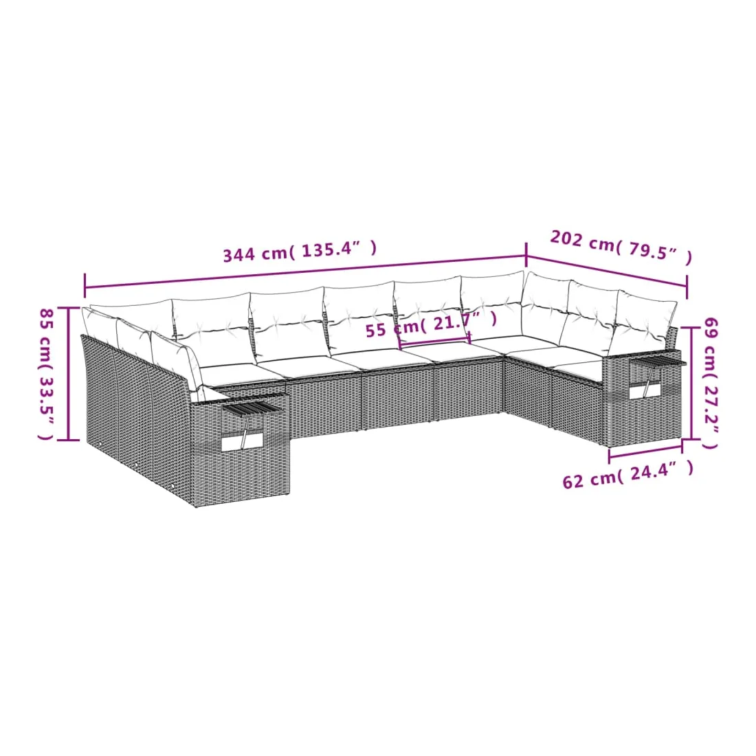 Cet ensemble de canapés de jardin est le complément parfait de votre arrière-cour, terrasse ou patio, offrant un espace confortable et accueillant pour discuter avec la famille et les amis ou simplement se détendre et profiter de l'extérieur. Matériau durable : la résine tressée, également connue sous le nom de poly rotin, est un matériau synthétique solide et nécessitant peu d'entretien qui ressemble au rotin naturel. Il est léger, facile à nettoyer et couramment utilisé pour les meubles d'extérieur en raison de sa durabilité et de ses propriétés de résistance aux intempéries. Table d'appoint pratique : ce mobilier d'extérieur comprend des tables d'appoint pliables avec un ressort à gaz sur les accoudoirs, offrant des endroits pratiques pour garder vos essentiels à portée de main. Expérience d'assise confortable : ce mobilier d'extérieur, doté de coussins épais, offre une expérience d'assise confortable.Housse amovible et lavable : ces coussins de siège sont dotés de housses amovibles pour un lavage et un entretien faciles.Conception modulaire : cet ensemble de meubles d'extérieur a une conception modulaire, ce qui le rend complètement flexible et facile à déplacer, afin que vous puissiez créer un agencement de meubles d'extérieur personnalisé. Bon à savoir :Pour que vos meubles d'extérieur restent beaux, nous vous recommandons de les protéger avec une housse imperméable.