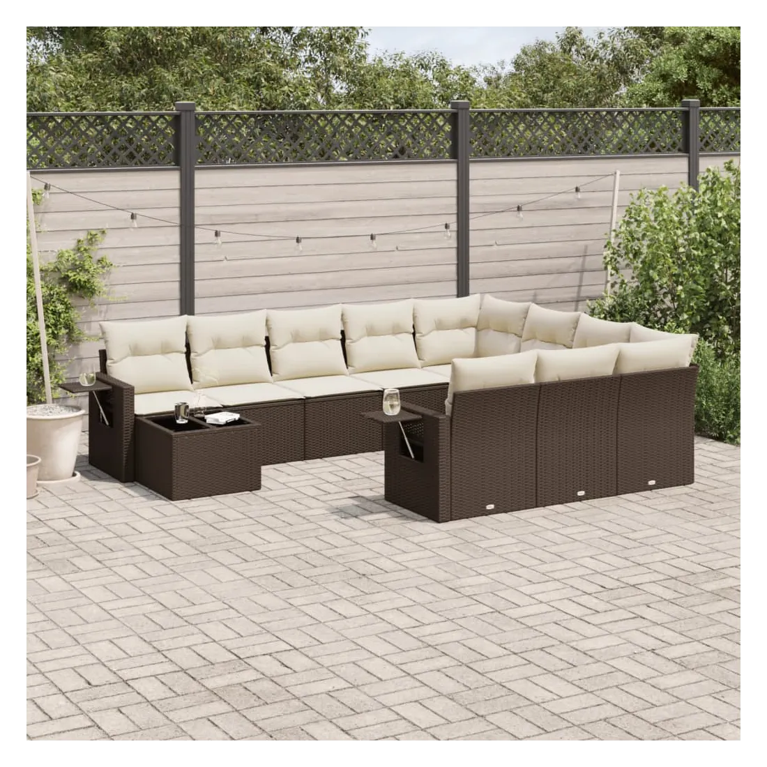 Cet ensemble de canapés de jardin est le complément parfait de votre arrière-cour, terrasse ou patio, offrant un espace confortable et accueillant pour discuter avec la famille et les amis ou simplement se détendre et profiter de l'extérieur. Matériau durable : la résine tressée, également connue sous le nom de poly rotin, est un matériau synthétique solide et nécessitant peu d'entretien qui ressemble au rotin naturel. Il est léger, facile à nettoyer et couramment utilisé pour les meubles d'extérieur en raison de sa durabilité et de ses propriétés de résistance aux intempéries.Dessus en verre : le dessus de la table d'extérieur est fabriqué en verre trempé solide et durable, ce qui le rend facile à nettoyer avec un chiffon humide et ajoute une touche d'élégance à votre espace extérieur. Table d'appoint pratique : ce mobilier d'extérieur comprend des tables d'appoint pliables avec un ressort à gaz sur les accoudoirs, offrant des endroits pratiques pour garder vos essentiels à portée de main. Expérience d'assise confortable : ce mobilier d'extérieur, doté de coussins épais, offre une expérience d'assise confortable.Conception modulaire : cet ensemble de meubles d'extérieur a une conception modulaire, ce qui le rend complètement flexible et facile à déplacer, afin que vous puissiez créer un agencement de meubles d'extérieur personnalisé. Bon à savoir :Pour que vos meubles d'extérieur restent beaux, nous vous recommandons de les protéger avec une housse imperméable.