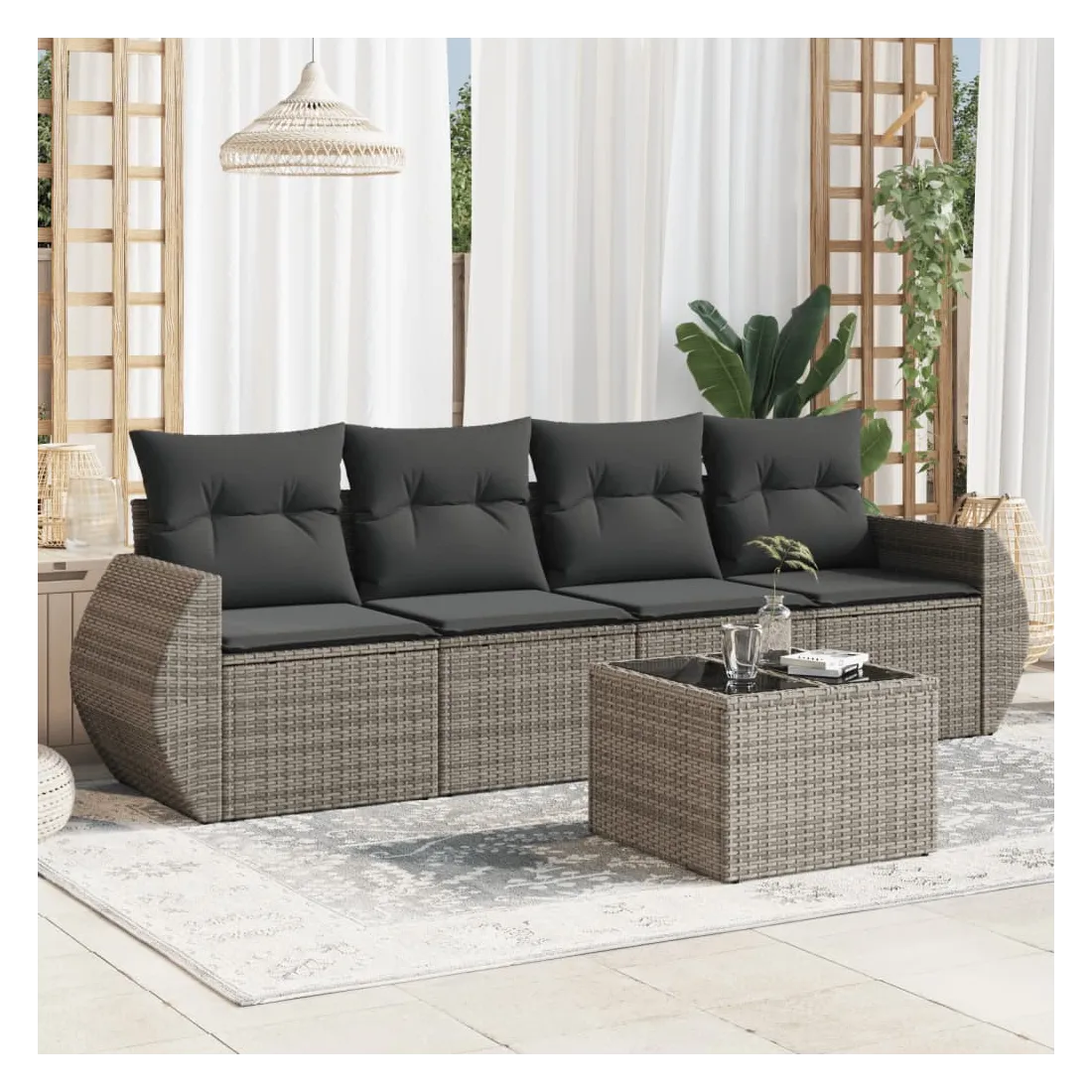 Cet ensemble de canapés de jardin est le complément parfait de votre arrière-cour, terrasse ou patio, offrant un espace confortable et accueillant pour discuter avec la famille et les amis ou simplement se détendre et profiter de l'extérieur. Matériau durable : la résine tressée, également connue sous le nom de poly rotin, est un matériau synthétique solide et nécessitant peu d'entretien qui ressemble au rotin naturel. Il est léger, facile à nettoyer et couramment utilisé pour les meubles d'extérieur en raison de sa durabilité et de ses propriétés de résistance aux intempéries.Dessus en verre : le dessus de la table d'extérieur est fabriqué en verre trempé solide et durable, ce qui le rend facile à nettoyer avec un chiffon humide et ajoute une touche d'élégance à votre espace extérieur. Expérience d'assise confortable : ce mobilier d'extérieur, doté de coussins épais, offre une expérience d'assise confortable. Housse amovible et lavable : ces coussins de siège sont dotés de housses amovibles pour un lavage et un entretien faciles.Conception modulaire : cet ensemble de meubles d'extérieur a une conception modulaire, ce qui le rend complètement flexible et facile à déplacer, afin que vous puissiez créer un agencement de meubles d'extérieur personnalisé. Bon à savoir :Pour que vos meubles d'extérieur restent beaux, nous vous recommandons de les protéger avec une housse imperméable.