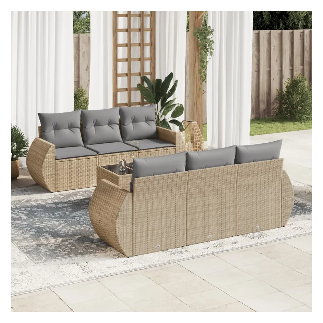 Cet ensemble de canapés de jardin est le complément parfait de votre arrière-cour, terrasse ou patio, offrant un espace confortable et accueillant pour discuter avec la famille et les amis ou simplement se détendre et profiter de l'extérieur. Matériau durable : la résine tressée, également connue sous le nom de poly rotin, est un matériau synthétique solide et nécessitant peu d'entretien qui ressemble au rotin naturel. Il est léger, facile à nettoyer et couramment utilisé pour les meubles d'extérieur en raison de sa durabilité et de ses propriétés de résistance aux intempéries.Dessus en verre : le dessus de la table d'extérieur est fabriqué en verre trempé solide et durable, ce qui le rend facile à nettoyer avec un chiffon humide et ajoute une touche d'élégance à votre espace extérieur. Expérience d'assise confortable : ce mobilier d'extérieur, doté de coussins épais, offre une expérience d'assise confortable. Housse amovible et lavable : ces coussins de siège sont dotés de housses amovibles pour un lavage et un entretien faciles.Conception modulaire : cet ensemble de meubles d'extérieur a une conception modulaire, ce qui le rend complètement flexible et facile à déplacer, afin que vous puissiez créer un agencement de meubles d'extérieur personnalisé. Bon à savoir :Pour que vos meubles d'extérieur restent beaux, nous vous recommandons de les protéger avec une housse imperméable.