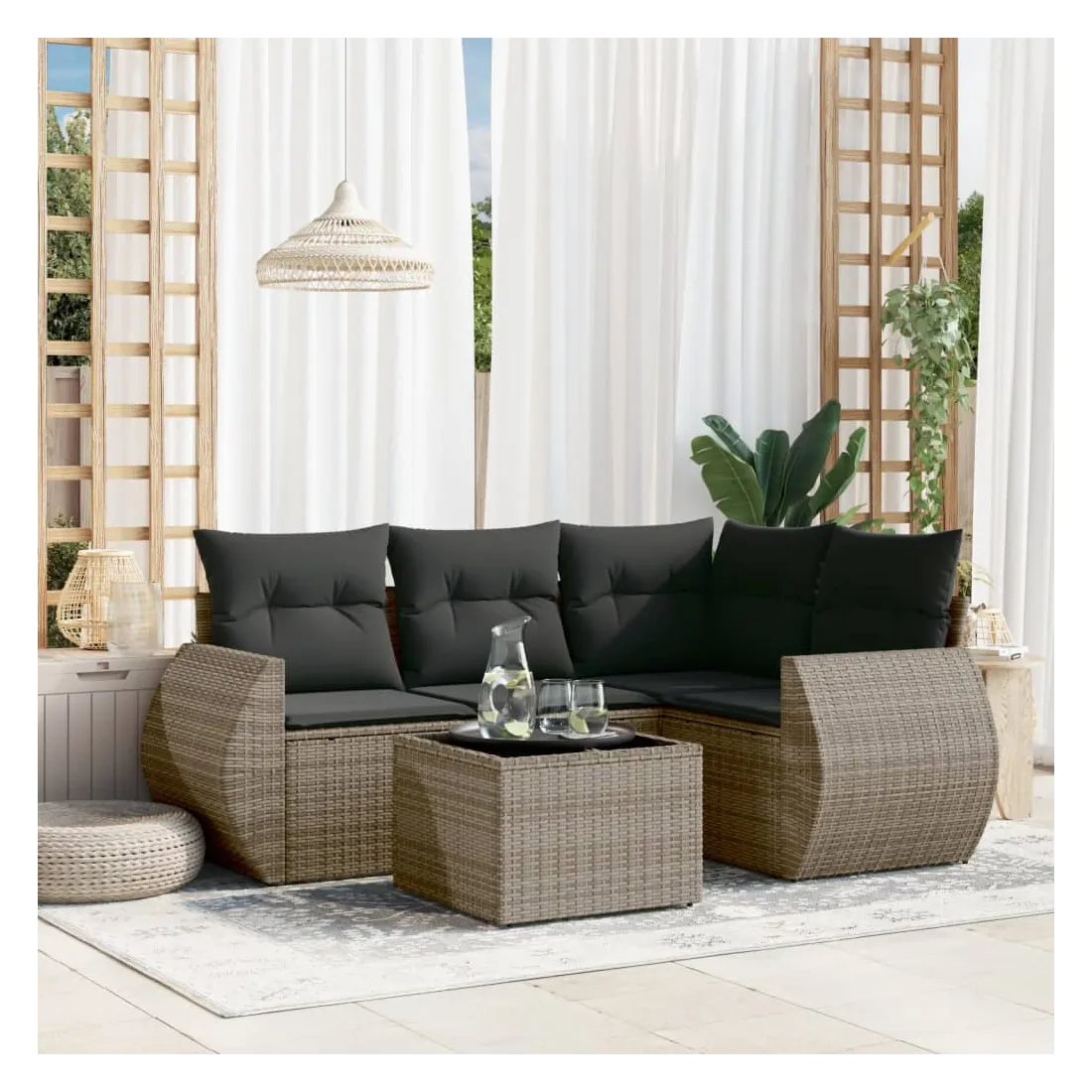 Cet ensemble de canapés de jardin est le complément parfait de votre arrière-cour, terrasse ou patio, offrant un espace confortable et accueillant pour discuter avec la famille et les amis ou simplement se détendre et profiter de l'extérieur. Matériau durable : la résine tressée, également connue sous le nom de poly rotin, est un matériau synthétique solide et nécessitant peu d'entretien qui ressemble au rotin naturel. Il est léger, facile à nettoyer et couramment utilisé pour les meubles d'extérieur en raison de sa durabilité et de ses propriétés de résistance aux intempéries.Dessus en verre : le dessus de la table d'extérieur est fabriqué en verre trempé solide et durable, ce qui le rend facile à nettoyer avec un chiffon humide et ajoute une touche d'élégance à votre espace extérieur. Expérience d'assise confortable : ce mobilier d'extérieur, doté de coussins épais, offre une expérience d'assise confortable.Housse amovible et lavable : ces coussins de siège sont dotés de housses amovibles pour un lavage et un entretien faciles.Conception modulaire : cet ensemble de meubles d'extérieur a une conception modulaire, ce qui le rend complètement flexible et facile à déplacer, afin que vous puissiez créer un agencement de meubles d'extérieur personnalisé. Bon à savoir :Pour que vos meubles d'extérieur restent beaux, nous vous recommandons de les protéger avec une housse imperméable.