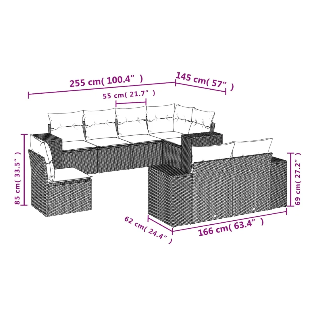 Cet ensemble de canapés de jardin est le complément parfait de votre arrière-cour, terrasse ou patio, offrant un espace confortable et accueillant pour discuter avec la famille et les amis ou simplement se détendre et profiter de l'extérieur. Matériau durable : la résine tressée, également connue sous le nom de poly rotin, est un matériau synthétique solide et nécessitant peu d'entretien qui ressemble au rotin naturel. Il est léger, facile à nettoyer et couramment utilisé pour les meubles d'extérieur en raison de sa durabilité et de ses propriétés de résistance aux intempéries.Expérience d'assise confortable : ce mobilier d'extérieur, doté de coussins épais, offre une expérience d'assise confortable.Housse amovible et lavable : ces coussins de siège sont dotés de housses amovibles pour un lavage et un entretien faciles.Conception modulaire : cet ensemble de meubles d'extérieur a une conception modulaire, ce qui le rend complètement flexible et facile à déplacer, afin que vous puissiez créer un agencement de meubles d'extérieur personnalisé. Bon à savoir :Pour que vos meubles d'extérieur restent beaux, nous vous recommandons de les protéger avec une housse imperméable.