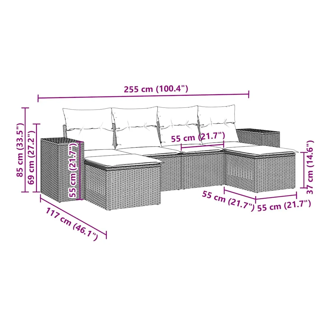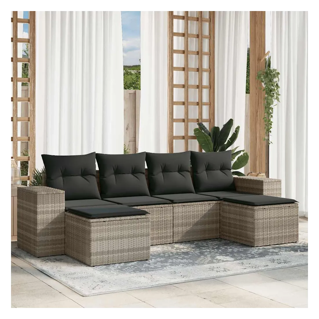 Cet ensemble de canapés de jardin est le complément parfait de votre arrière-cour, terrasse ou patio, offrant un espace confortable et accueillant pour discuter avec la famille et les amis ou simplement se détendre et profiter de l'extérieur. Matériau durable : la résine tressée, également connue sous le nom de poly rotin, est un matériau synthétique solide et nécessitant peu d'entretien qui ressemble au rotin naturel. Il est léger, facile à nettoyer et couramment utilisé pour les meubles d'extérieur en raison de sa durabilité et de ses propriétés de résistance aux intempéries.Expérience d'assise confortable : ce mobilier d'extérieur, doté de coussins épais, offre une expérience d'assise confortable.Housse amovible et lavable : ces coussins de siège sont dotés de housses amovibles pour un lavage et un entretien faciles.Conception modulaire : cet ensemble de meubles d'extérieur a une conception modulaire, ce qui le rend complètement flexible et facile à déplacer, afin que vous puissiez créer un agencement de meubles d'extérieur personnalisé. Bon à savoir :Pour que vos meubles d'extérieur restent beaux, nous vous recommandons de les protéger avec une housse imperméable.