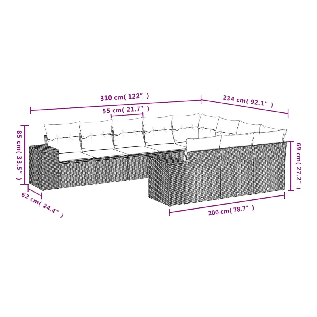 Cet ensemble de canapés de jardin est le complément parfait de votre arrière-cour, terrasse ou patio, offrant un espace confortable et accueillant pour discuter avec la famille et les amis ou simplement se détendre et profiter de l'extérieur. Matériau durable : la résine tressée, également connue sous le nom de poly rotin, est un matériau synthétique solide et nécessitant peu d'entretien qui ressemble au rotin naturel. Il est léger, facile à nettoyer et couramment utilisé pour les meubles d'extérieur en raison de sa durabilité et de ses propriétés de résistance aux intempéries.Expérience d'assise confortable : ce mobilier d'extérieur, doté de coussins épais, offre une expérience d'assise confortable.Housse amovible et lavable : ces coussins de siège sont dotés de housses amovibles pour un lavage et un entretien faciles.Conception modulaire : cet ensemble de meubles d'extérieur a une conception modulaire, ce qui le rend complètement flexible et facile à déplacer, afin que vous puissiez créer un agencement de meubles d'extérieur personnalisé. Bon à savoir :Pour que vos meubles d'extérieur restent beaux, nous vous recommandons de les protéger avec une housse imperméable.