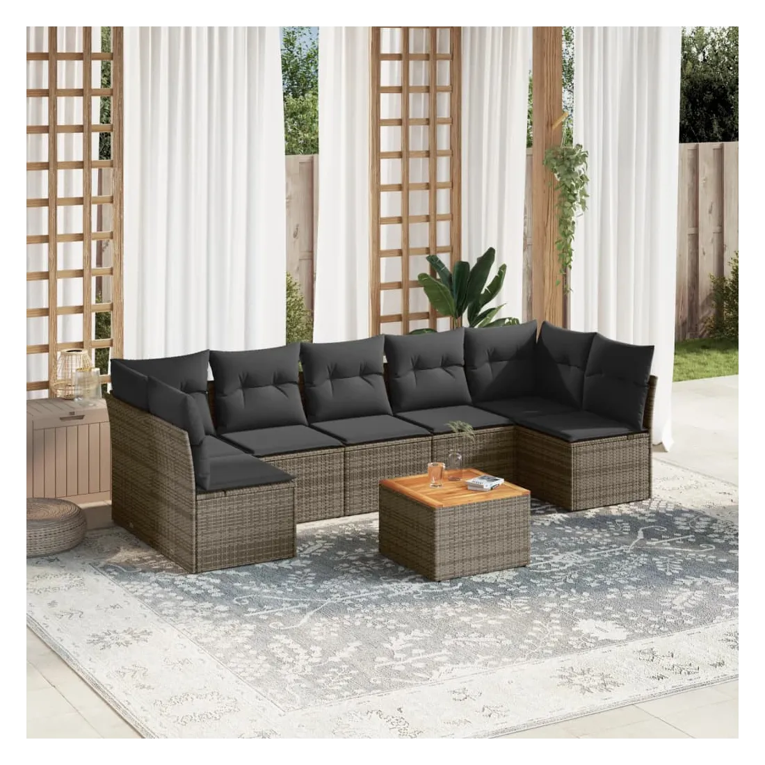 Cet ensemble de canapés de jardin est le complément parfait de votre arrière-cour, terrasse ou patio, offrant un espace confortable et accueillant pour discuter avec la famille et les amis ou simplement se détendre et profiter de l'extérieur. Matériau durable : la résine tressée, également connue sous le nom de poly rotin, est un matériau synthétique solide et nécessitant peu d'entretien qui ressemble au rotin naturel. Il est léger, facile à nettoyer et couramment utilisé pour les meubles d'extérieur en raison de sa durabilité et de ses propriétés de résistance aux intempéries.Expérience d'assise confortable : ce mobilier d'extérieur, doté de coussins épais, offre une expérience d'assise confortable.Dessus stable et facile à nettoyer : cette table de jardin a un dessus en bois d'acacia robuste, durable et facile à nettoyer avec un chiffon humide.Housse amovible et lavable : ces coussins de siège sont dotés de housses amovibles pour un lavage et un entretien faciles.Conception modulaire : cet ensemble de meubles d'extérieur a une conception modulaire, ce qui le rend complètement flexible et facile à déplacer, afin que vous puissiez créer un agencement de meubles d'extérieur personnalisé. Bon à savoir :Pour que vos meubles d'extérieur restent beaux, nous vous recommandons de les protéger avec une housse imperméable.
