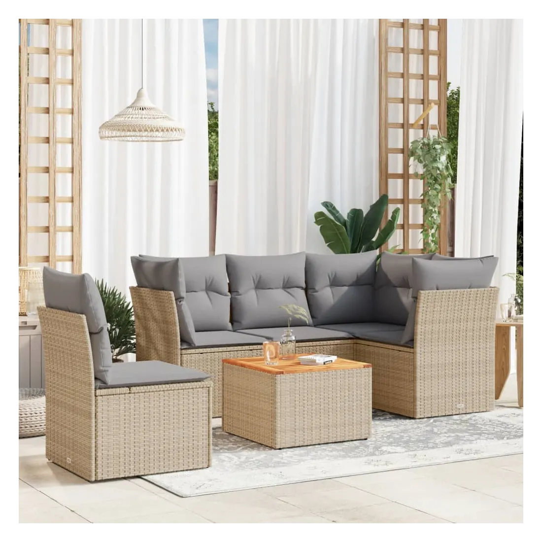 Cet ensemble de canapés de jardin est le complément parfait de votre arrière-cour, terrasse ou patio, offrant un espace confortable et accueillant pour discuter avec la famille et les amis ou simplement se détendre et profiter de l'extérieur. Matériau durable : la résine tressée, également connue sous le nom de poly rotin, est un matériau synthétique solide et nécessitant peu d'entretien qui ressemble au rotin naturel. Il est léger, facile à nettoyer et couramment utilisé pour les meubles d'extérieur en raison de sa durabilité et de ses propriétés de résistance aux intempéries.Expérience d'assise confortable : ce mobilier d'extérieur, doté de coussins épais, offre une expérience d'assise confortable.Dessus stable et facile à nettoyer : cette table de jardin a un dessus en bois d'acacia robuste, durable et facile à nettoyer avec un chiffon humide.Housse amovible et lavable : ces coussins de siège sont dotés de housses amovibles pour un lavage et un entretien faciles.Conception modulaire : cet ensemble de meubles d'extérieur a une conception modulaire, ce qui le rend complètement flexible et facile à déplacer, afin que vous puissiez créer un agencement de meubles d'extérieur personnalisé. Bon à savoir :Pour que vos meubles d'extérieur restent beaux, nous vous recommandons de les protéger avec une housse imperméable.