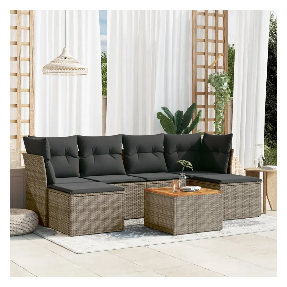 Cet ensemble de canapés de jardin est le complément parfait de votre arrière-cour, terrasse ou patio, offrant un espace confortable et accueillant pour discuter avec la famille et les amis ou simplement se détendre et profiter de l'extérieur. Matériau durable : la résine tressée, également connue sous le nom de poly rotin, est un matériau synthétique solide et nécessitant peu d'entretien qui ressemble au rotin naturel. Il est léger, facile à nettoyer et couramment utilisé pour les meubles d'extérieur en raison de sa durabilité et de ses propriétés de résistance aux intempéries.Expérience d'assise confortable : ce mobilier d'extérieur, doté de coussins épais, offre une expérience d'assise confortable.Dessus stable et facile à nettoyer : cette table de jardin a un dessus en bois d'acacia robuste, durable et facile à nettoyer avec un chiffon humide.Housse amovible et lavable : ces coussins de siège sont dotés de housses amovibles pour un lavage et un entretien faciles.Conception modulaire : cet ensemble de meubles d'extérieur a une conception modulaire, ce qui le rend complètement flexible et facile à déplacer, afin que vous puissiez créer un agencement de meubles d'extérieur personnalisé. Bon à savoir :Pour que vos meubles d'extérieur restent beaux, nous vous recommandons de les protéger avec une housse imperméable.