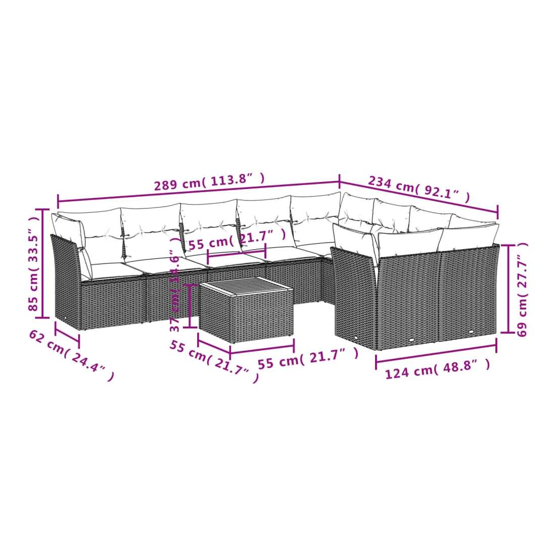 • 9 x coussin d'assise avec housse amovible et lavable