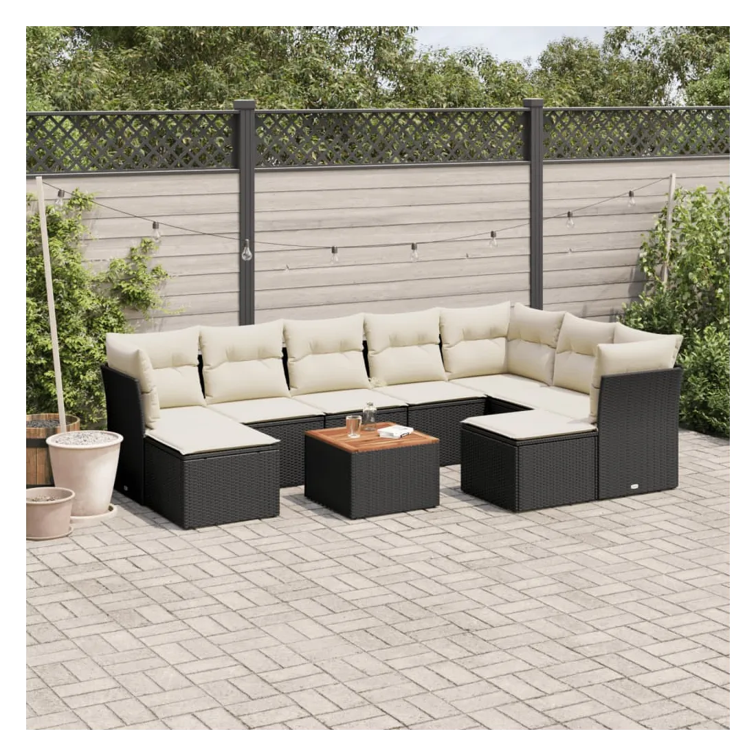 Cet ensemble de canapés de jardin est le complément parfait de votre arrière-cour, terrasse ou patio, offrant un espace confortable et accueillant pour discuter avec la famille et les amis ou simplement se détendre et profiter de l'extérieur. Matériau durable : la résine tressée, également connue sous le nom de poly rotin, est un matériau synthétique solide et nécessitant peu d'entretien qui ressemble au rotin naturel. Il est léger, facile à nettoyer et couramment utilisé pour les meubles d'extérieur en raison de sa durabilité et de ses propriétés de résistance aux intempéries.Expérience d'assise confortable : ce mobilier d'extérieur, doté de coussins épais, offre une expérience d'assise confortable.Dessus stable et facile à nettoyer : cette table de jardin a un dessus en bois d'acacia robuste, durable et facile à nettoyer avec un chiffon humide.Housse amovible et lavable : ces coussins de siège sont dotés de housses amovibles pour un lavage et un entretien faciles.Conception modulaire : cet ensemble de meubles d'extérieur a une conception modulaire, ce qui le rend complètement flexible et facile à déplacer, afin que vous puissiez créer un agencement de meubles d'extérieur personnalisé. Bon à savoir :Pour que vos meubles d'extérieur restent beaux, nous vous recommandons de les protéger avec une housse imperméable.