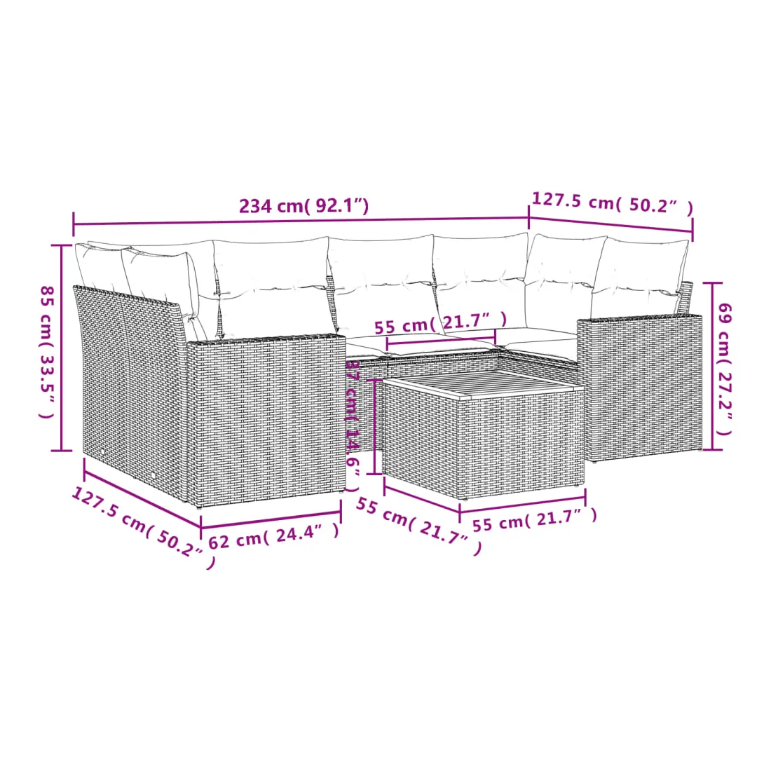 Cet ensemble de canapés de jardin est le complément parfait de votre arrière-cour, terrasse ou patio, offrant un espace confortable et accueillant pour discuter avec la famille et les amis ou simplement se détendre et profiter de l'extérieur. Matériau durable : la résine tressée, également connue sous le nom de poly rotin, est un matériau synthétique solide et nécessitant peu d'entretien qui ressemble au rotin naturel. Il est léger, facile à nettoyer et couramment utilisé pour les meubles d'extérieur en raison de sa durabilité et de ses propriétés de résistance aux intempéries.Expérience d'assise confortable : ce mobilier d'extérieur, doté de coussins épais, offre une expérience d'assise confortable.Dessus stable et facile à nettoyer : cette table de jardin a un dessus en bois d'acacia robuste, durable et facile à nettoyer avec un chiffon humide.Housse amovible et lavable : ces coussins de siège sont dotés de housses amovibles pour un lavage et un entretien faciles.Conception modulaire : cet ensemble de meubles d'extérieur a une conception modulaire, ce qui le rend complètement flexible et facile à déplacer, afin que vous puissiez créer un agencement de meubles d'extérieur personnalisé. Bon à savoir :Pour que vos meubles d'extérieur restent beaux, nous vous recommandons de les protéger avec une housse imperméable.