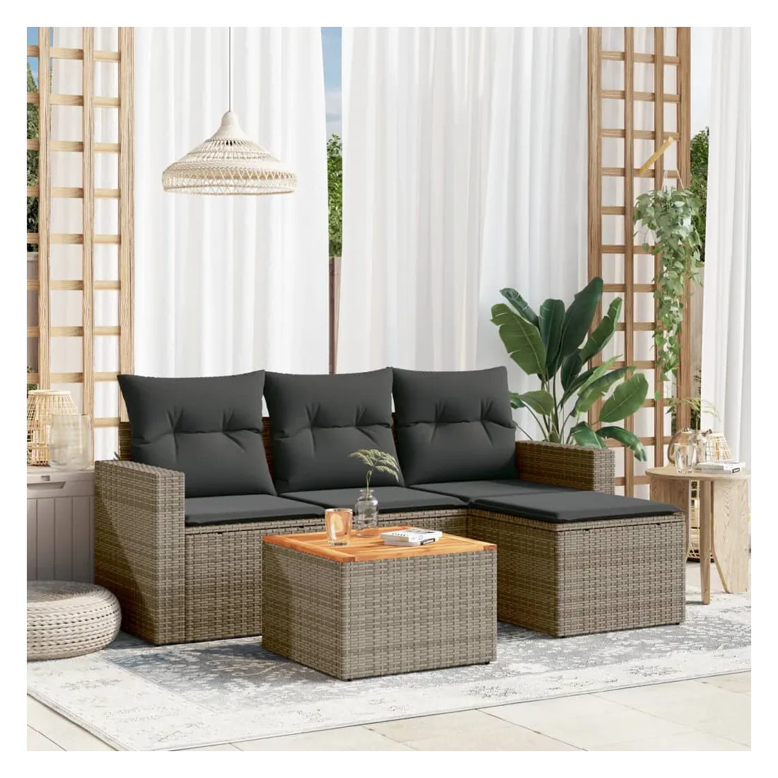 Cet ensemble de canapés de jardin est le complément parfait de votre arrière-cour, terrasse ou patio, offrant un espace confortable et accueillant pour discuter avec la famille et les amis ou simplement se détendre et profiter de l'extérieur. Matériau durable : la résine tressée, également connue sous le nom de poly rotin, est un matériau synthétique solide et nécessitant peu d'entretien qui ressemble au rotin naturel. Il est léger, facile à nettoyer et couramment utilisé pour les meubles d'extérieur en raison de sa durabilité et de ses propriétés de résistance aux intempéries.Expérience d'assise confortable : ce mobilier d'extérieur, doté de coussins épais, offre une expérience d'assise confortable.Dessus stable et facile à nettoyer : cette table de jardin a un dessus en bois d'acacia robuste, durable et facile à nettoyer avec un chiffon humide.Housse amovible et lavable : ces coussins de siège sont dotés de housses amovibles pour un lavage et un entretien faciles.Conception modulaire : cet ensemble de meubles d'extérieur a une conception modulaire, ce qui le rend complètement flexible et facile à déplacer, afin que vous puissiez créer un agencement de meubles d'extérieur personnalisé. Bon à savoir :Pour que vos meubles d'extérieur restent beaux, nous vous recommandons de les protéger avec une housse imperméable.