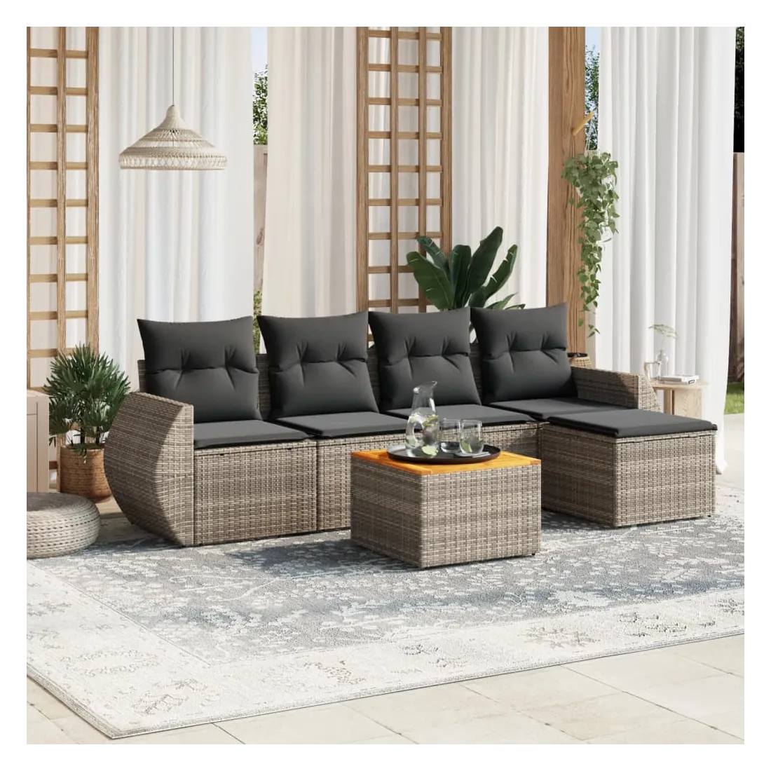 Cet ensemble de canapés de jardin est le complément parfait de votre arrière-cour, terrasse ou patio, offrant un espace confortable et accueillant pour discuter avec la famille et les amis ou simplement se détendre et profiter de l'extérieur. Matériau durable : la résine tressée, également connue sous le nom de poly rotin, est un matériau synthétique solide et nécessitant peu d'entretien qui ressemble au rotin naturel. Il est léger, facile à nettoyer et couramment utilisé pour les meubles d'extérieur en raison de sa durabilité et de ses propriétés de résistance aux intempéries.Dessus stable et facile à nettoyer : cette table de jardin a un dessus en bois d'acacia robuste, durable et facile à nettoyer avec un chiffon humide. Expérience d'assise confortable : ce mobilier d'extérieur, doté de coussins épais, offre une expérience d'assise confortable.Housse amovible et lavable : ces coussins de siège sont dotés de housses amovibles pour un lavage et un entretien faciles.Conception modulaire : cet ensemble de meubles d'extérieur a une conception modulaire, ce qui le rend complètement flexible et facile à déplacer, afin que vous puissiez créer un agencement de meubles d'extérieur personnalisé. Bon à savoir :Pour que vos meubles d'extérieur restent beaux, nous vous recommandons de les protéger avec une housse imperméable.