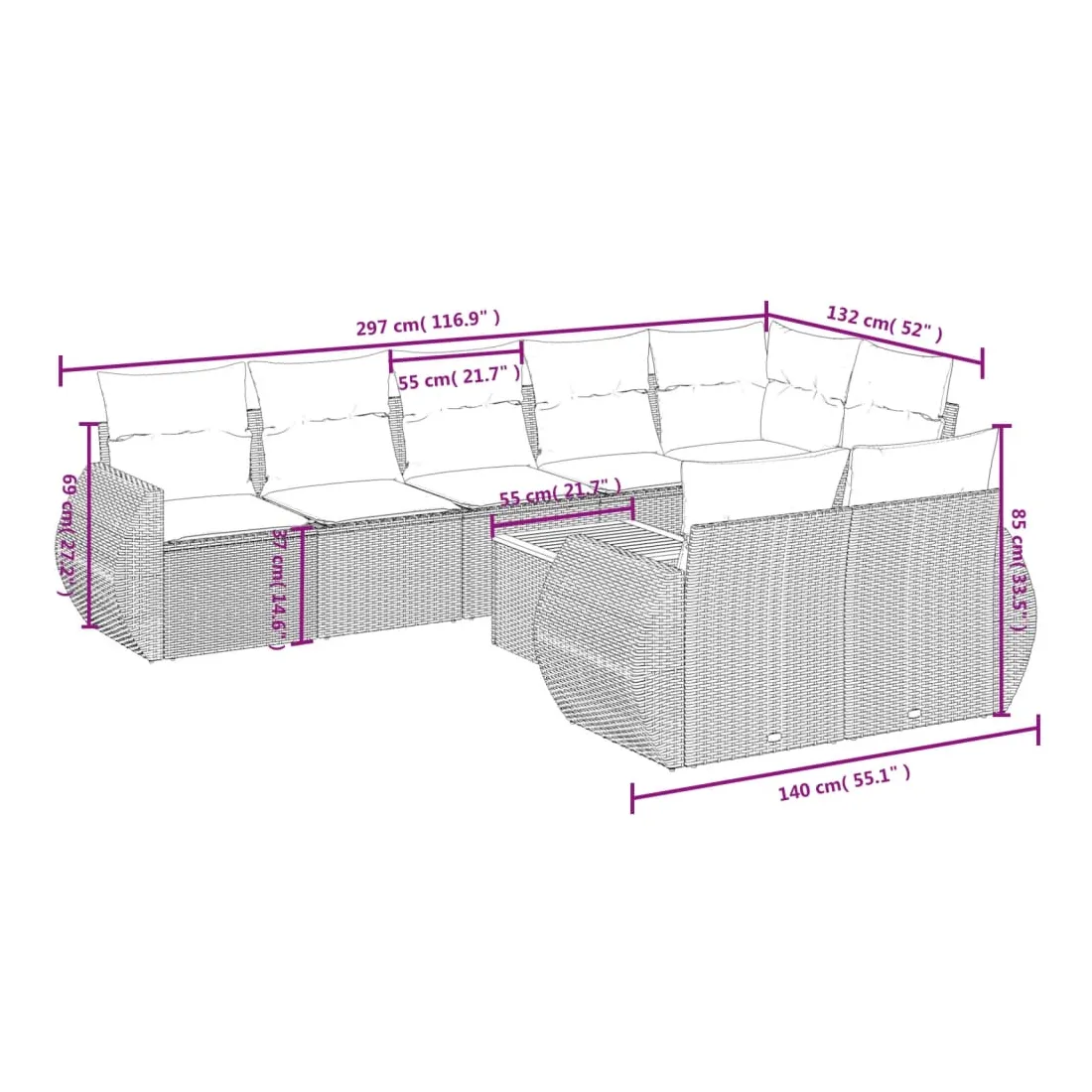 • Dimensions du coussin de siège : 55 x 55 x 3 cm (l x P x é)