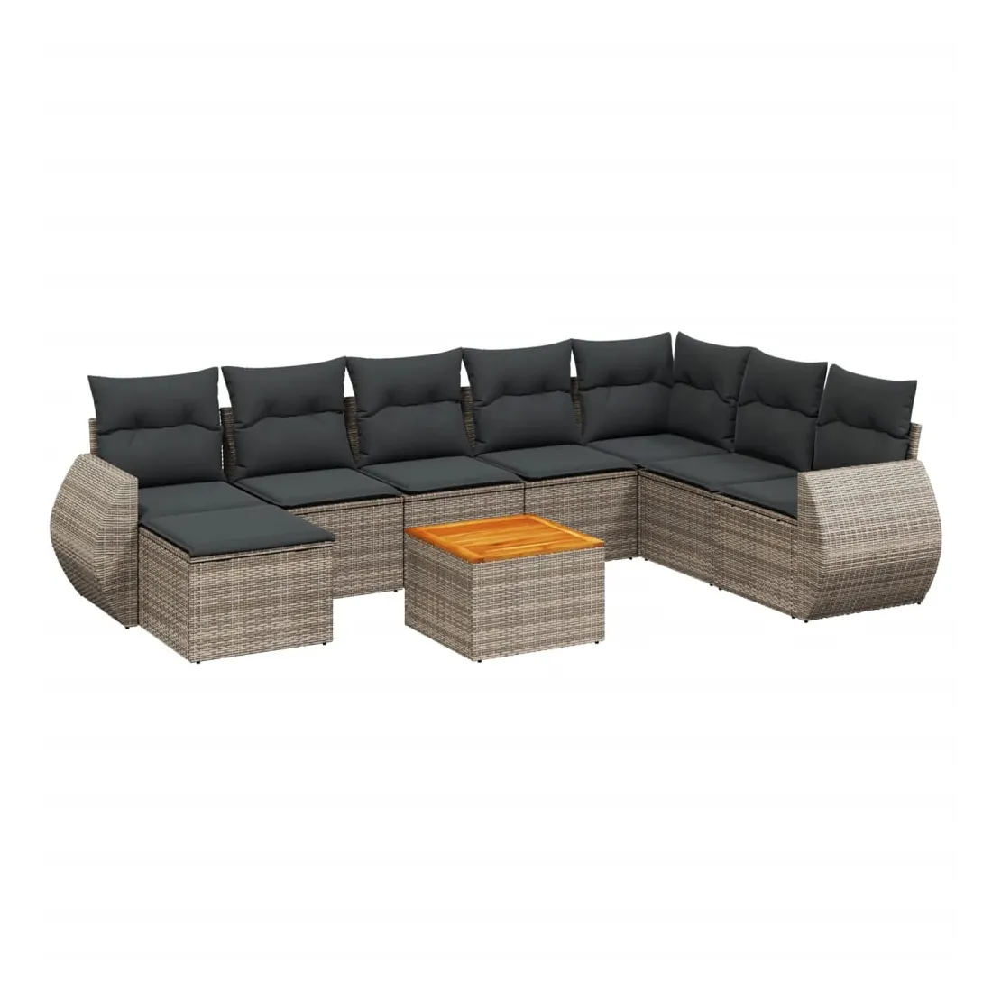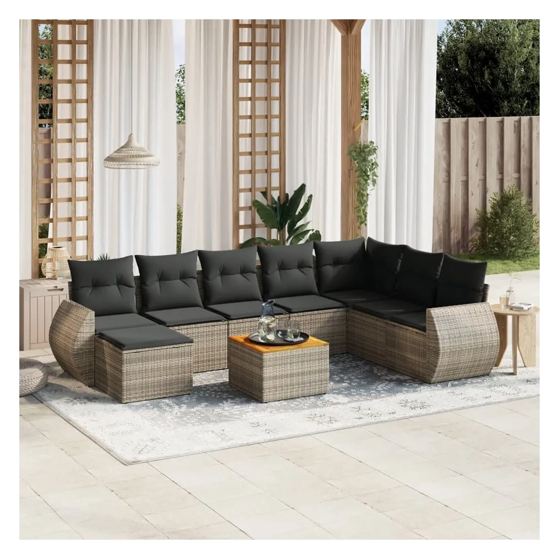 Cet ensemble de canapés de jardin est le complément parfait de votre arrière-cour, terrasse ou patio, offrant un espace confortable et accueillant pour discuter avec la famille et les amis ou simplement se détendre et profiter de l'extérieur. Matériau durable : la résine tressée, également connue sous le nom de poly rotin, est un matériau synthétique solide et nécessitant peu d'entretien qui ressemble au rotin naturel. Il est léger, facile à nettoyer et couramment utilisé pour les meubles d'extérieur en raison de sa durabilité et de ses propriétés de résistance aux intempéries.Dessus stable et facile à nettoyer : cette table de jardin a un dessus en bois d'acacia robuste, durable et facile à nettoyer avec un chiffon humide. Expérience d'assise confortable : ce mobilier d'extérieur, doté de coussins épais, offre une expérience d'assise confortable.Housse amovible et lavable : ces coussins de siège sont dotés de housses amovibles pour un lavage et un entretien faciles.Conception modulaire : cet ensemble de meubles d'extérieur a une conception modulaire, ce qui le rend complètement flexible et facile à déplacer, afin que vous puissiez créer un agencement de meubles d'extérieur personnalisé. Bon à savoir :Pour que vos meubles d'extérieur restent beaux, nous vous recommandons de les protéger avec une housse imperméable.