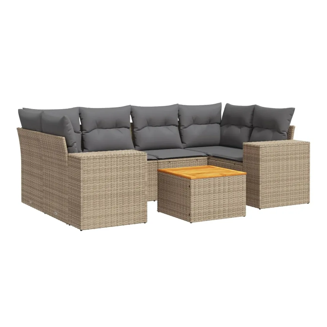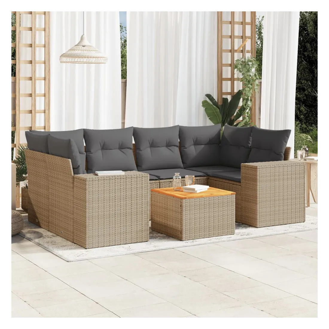 Cet ensemble de canapés de jardin est le complément parfait de votre arrière-cour, terrasse ou patio, offrant un espace confortable et accueillant pour discuter avec la famille et les amis ou simplement se détendre et profiter de l'extérieur. Matériau durable : la résine tressée, également connue sous le nom de poly rotin, est un matériau synthétique solide et nécessitant peu d'entretien qui ressemble au rotin naturel. Il est léger, facile à nettoyer et couramment utilisé pour les meubles d'extérieur en raison de sa durabilité et de ses propriétés de résistance aux intempéries.Dessus stable et facile à nettoyer : cette table de jardin a un dessus en bois d'acacia robuste, durable et facile à nettoyer avec un chiffon humide. Expérience d'assise confortable : ce mobilier d'extérieur, doté de coussins épais, offre une expérience d'assise confortable.Housse amovible et lavable : ces coussins de siège sont dotés de housses amovibles pour un lavage et un entretien faciles.Conception modulaire : cet ensemble de meubles d'extérieur a une conception modulaire, ce qui le rend complètement flexible et facile à déplacer, afin que vous puissiez créer un agencement de meubles d'extérieur personnalisé. Bon à savoir :Pour que vos meubles d'extérieur restent beaux, nous vous recommandons de les protéger avec une housse imperméable.