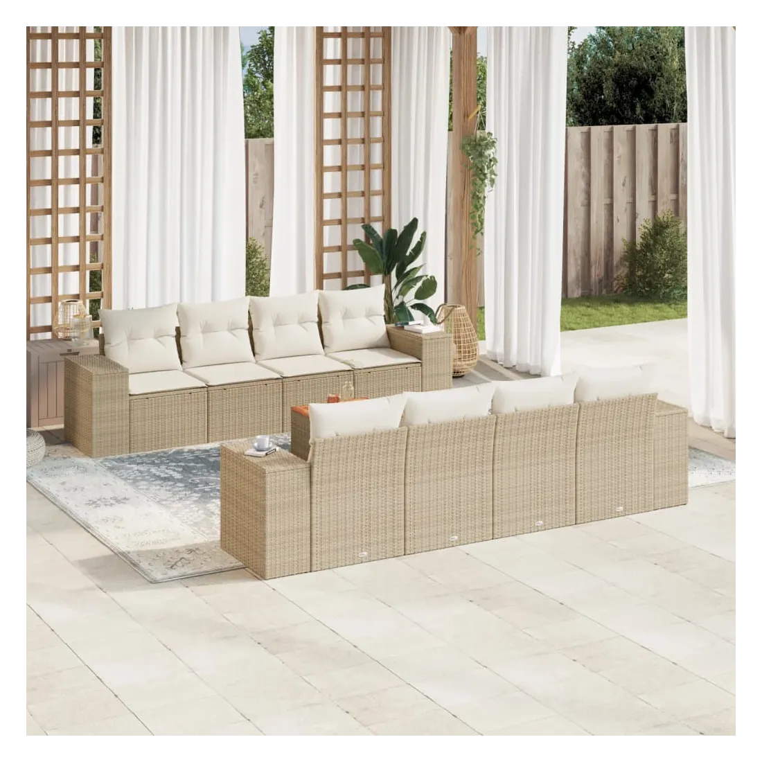 Cet ensemble de canapés de jardin est le complément parfait de votre arrière-cour, terrasse ou patio, offrant un espace confortable et accueillant pour discuter avec la famille et les amis ou simplement se détendre et profiter de l'extérieur. Matériau durable : la résine tressée, également connue sous le nom de poly rotin, est un matériau synthétique solide et nécessitant peu d'entretien qui ressemble au rotin naturel. Il est léger, facile à nettoyer et couramment utilisé pour les meubles d'extérieur en raison de sa durabilité et de ses propriétés de résistance aux intempéries.Dessus stable et facile à nettoyer : cette table de jardin a un dessus en bois d'acacia robuste, durable et facile à nettoyer avec un chiffon humide. Expérience d'assise confortable : ce mobilier d'extérieur, doté de coussins épais, offre une expérience d'assise confortable. Housse amovible et lavable : ces coussins de siège sont dotés de housses amovibles pour un lavage et un entretien faciles.Conception modulaire : cet ensemble de meubles d'extérieur a une conception modulaire, ce qui le rend complètement flexible et facile à déplacer, afin que vous puissiez créer un agencement de meubles d'extérieur personnalisé. Bon à savoir :Pour que vos meubles d'extérieur restent beaux, nous vous recommandons de les protéger avec une housse imperméable.