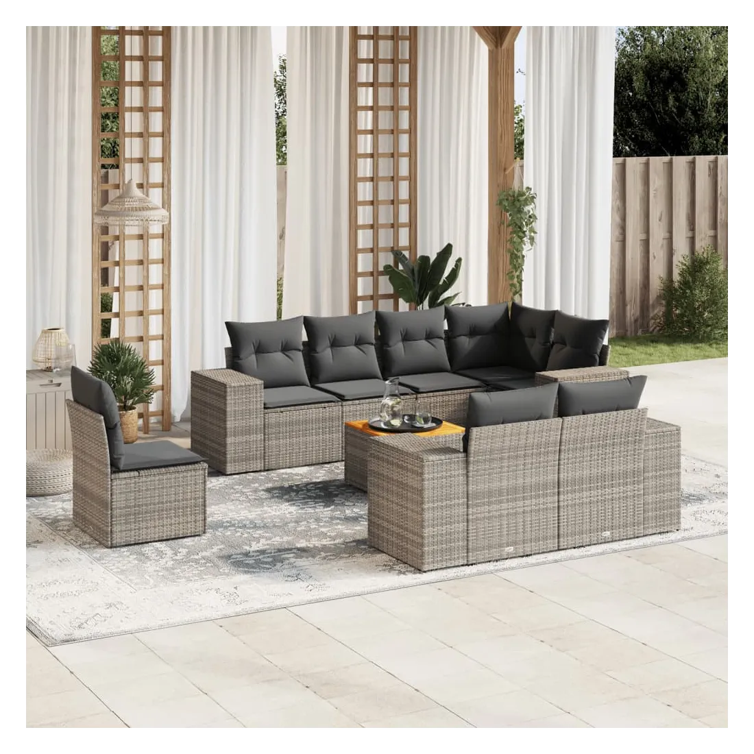 Salon de jardin 9 pcs avec coussins gris résine tressée